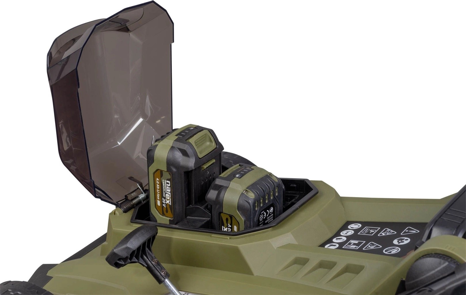 - Signalizační panel na ovládacím madle poskytuje okamžitý přehled o stavu baterií