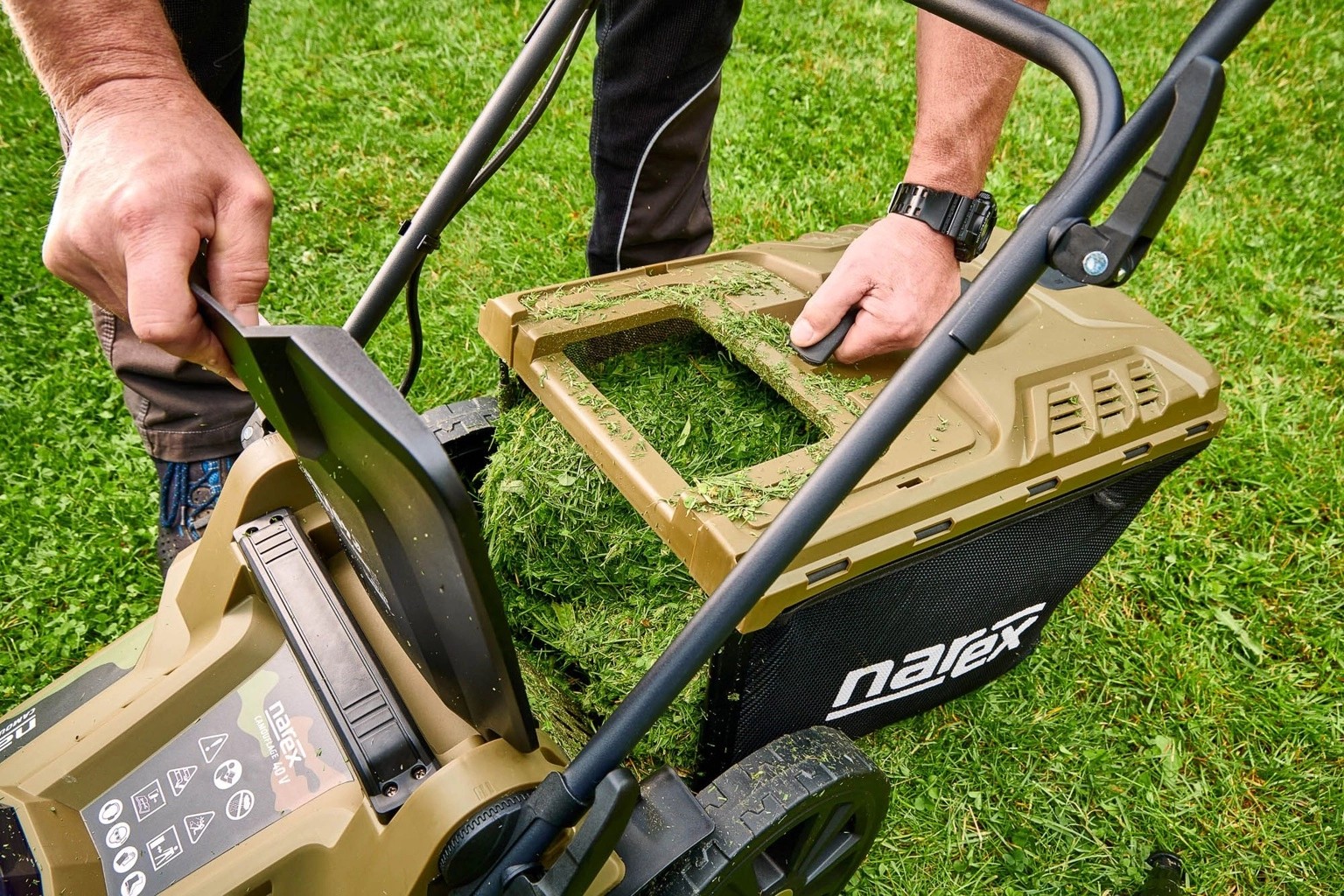 - Ukazatel stavu naplnění sběrného koše pro nejlepší výsledek sečení a sběru trávy