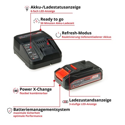 Startovací sada Einhell PXC 18 V, 2,5 Ah je ideálním základem pro vytvoření nebo rozšíření řady akumulátorů Power X-Change. Startovací sada se skládá z akumulátoru 18 V, 2,5 Ah Power X-Change a vysokorychlostní nabíječky. Univerzálně použitelné akumulátory Power X-Change poskytují energii a výkon všem akumulátorovým nástrojům z rodiny produktů Power X-Change v dílně i zahradě. Nabíječky ze série lze také použít pro každou dobíjecí baterii PXC.