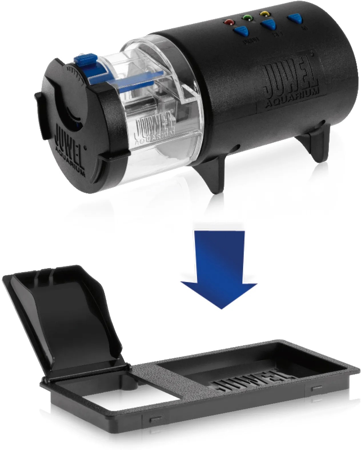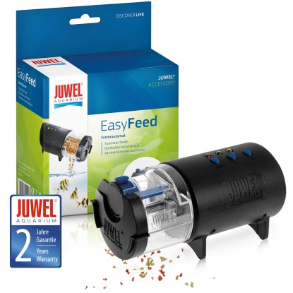 Programovatelné a automatické krmítko pro všechny typy akvárií, pro vločky, pelety a tablety s nastavitelným časem a množstvím krmení. Kapacita krmení na 30 dnů (60 krmení). Napájení: 2 AA 1,5 typ baterie. K umístění krmítka je třeba pouze vyříznout otvor do krycí klapky akvária, do kterého je pak možno nasadit nosnou misku pro krmítko. Nosná miska je konstruována tak, že obsahuje malou vyjímatelnou klapku, která uzavírá krycí otvor, pokud není krmítko v provozu. Krmítko naplníte krmením, na které jsou vaše ryby zvyklé a nastavíte dávkování podle návodu. Před cestou doporučujeme alespoň dva dny mít krmítko v provozu a hlídat správnost krmení. U mnoha akvárií Juwel Aquarium je tento otvor již vyražen a uzavřen víčkem.