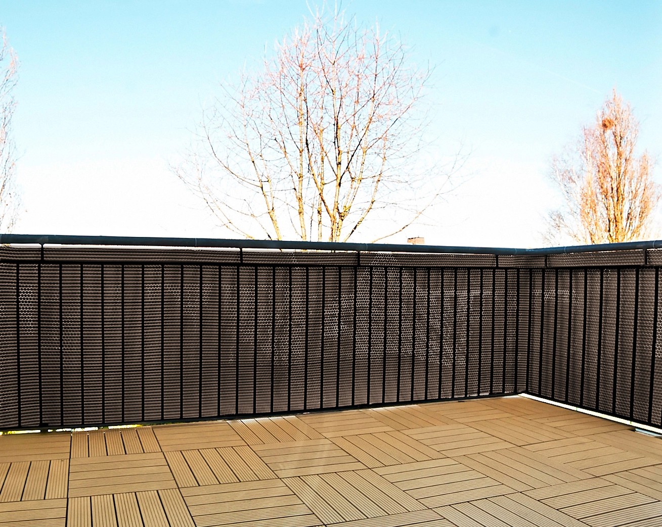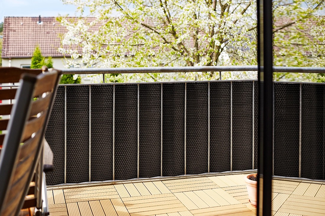 Ochranu umístíte na balkonové zábradlí pomocí přiložených stahovacích pásků. U tyčkových zábradlí ochranu jednoduše provléknete jednotlivými tyčemi. Rozměry protipohledové ochrany lze upravit zastřihnutím.