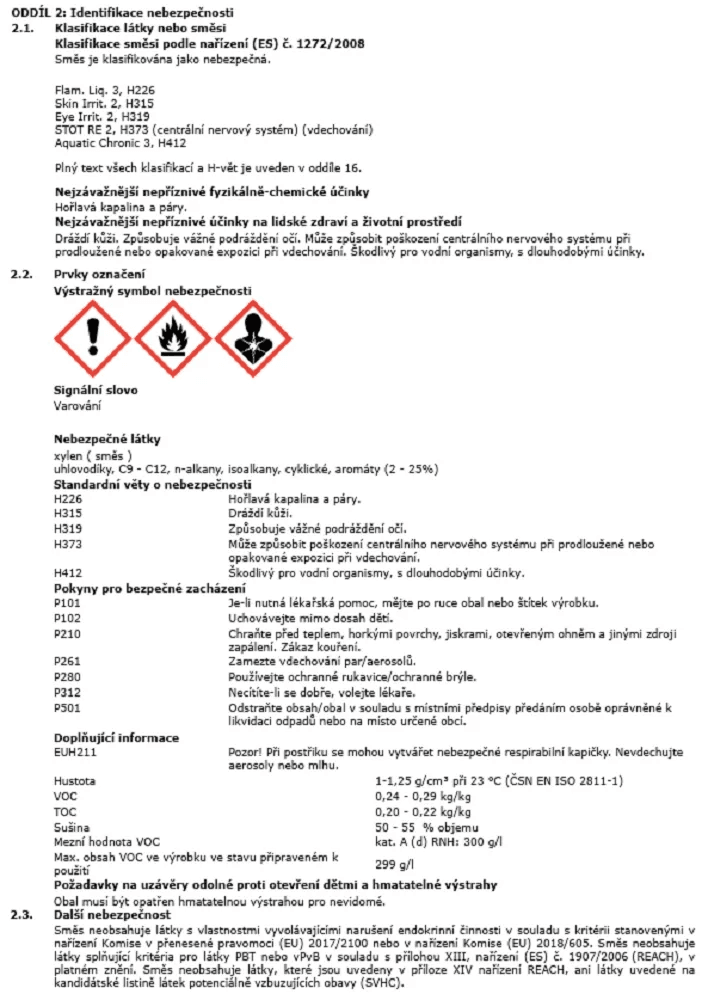 Email není určen k nátěrům, které přicházejí do přímého styku s potravinami, krmivy a pitnou vodou a nátěrům dětského nábytku a hraček. Smí být používán na plochy přicházející do nepřímého styku s poživatinami, krmivy a pitnou vodou.
