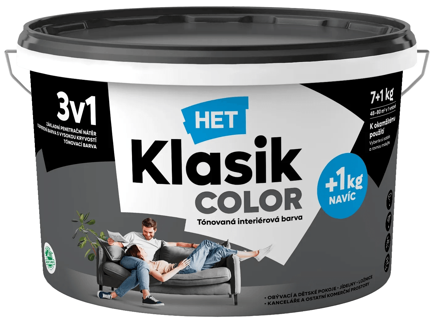 Tónovaná interiérová disperzní otěruvzdorná barva HET Klasik COLOR je nejoblíbenější barva na trhu. Je ideální pro obývací a komerční prostory, dětské pokoje, jídelny, chodby, kanceláře, prodejní prostory a další.