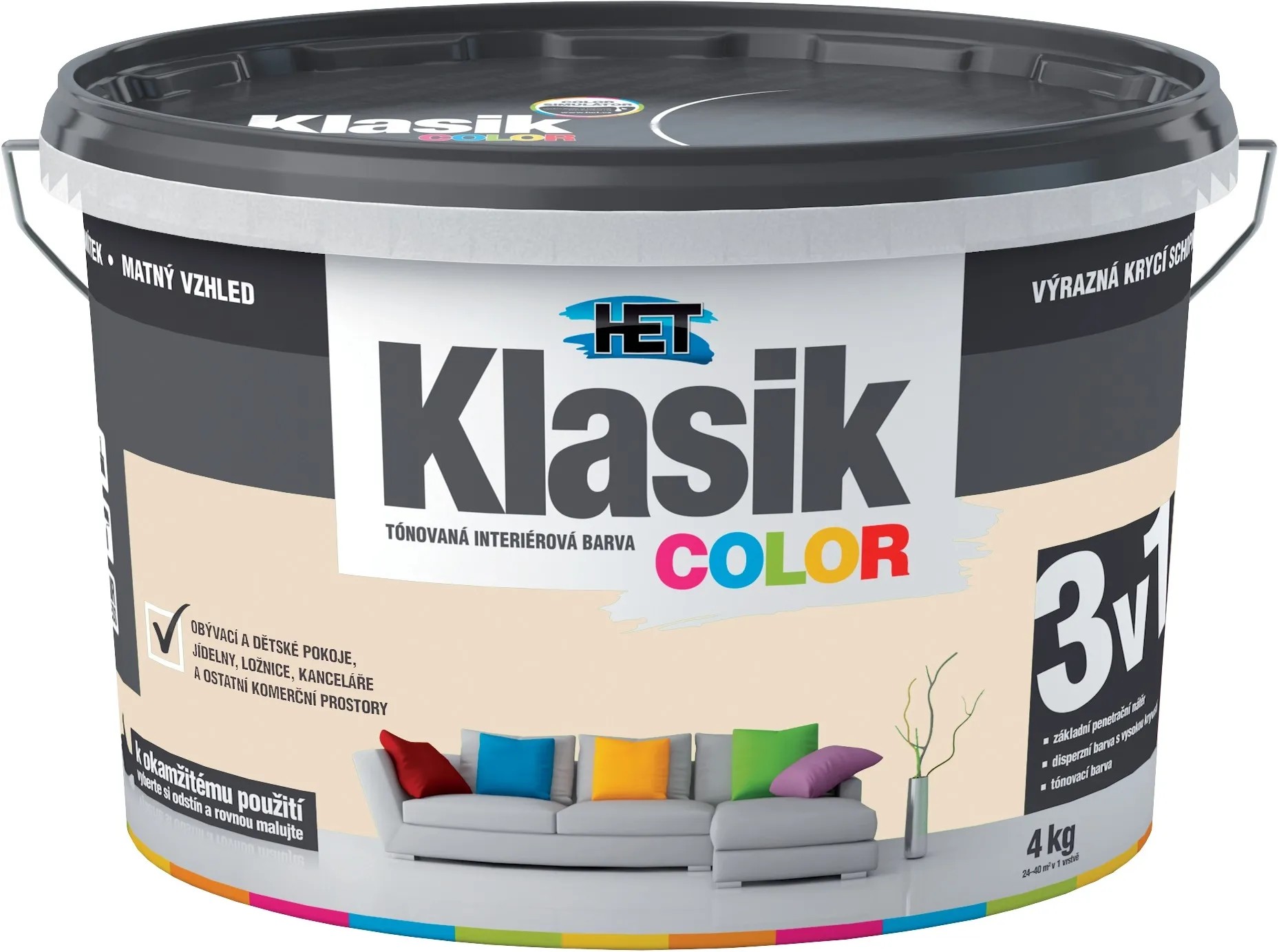 Tónovaná interiérová disperzní otěruvzdorná barva HET Klasik COLOR je nejoblíbenější barva na trhu. Je ideální pro obývací a komerční prostory, dětské pokoje, jídelny, chodby, kanceláře, prodejní prostory a další.