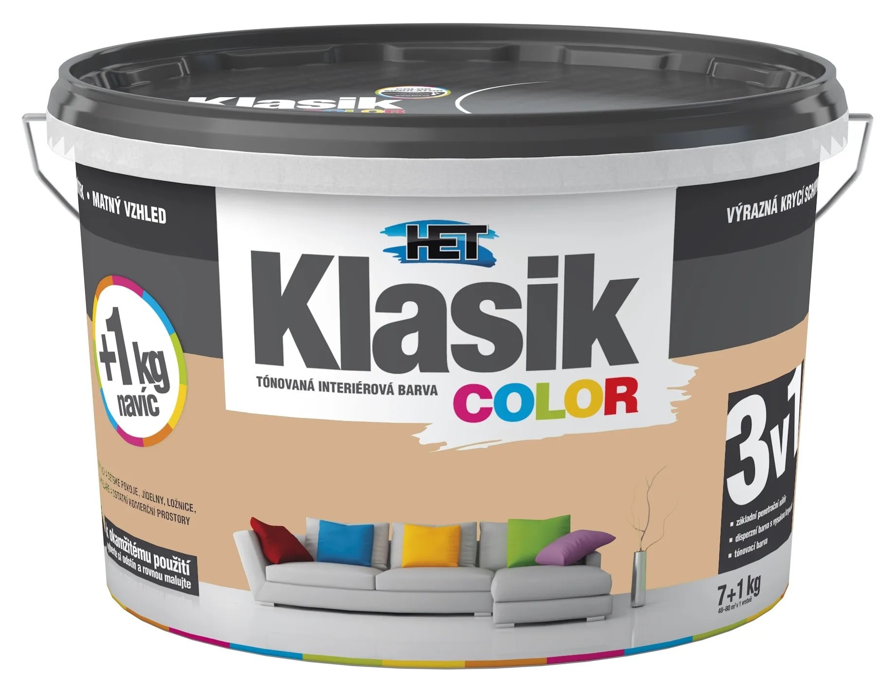 Tónovaná interiérová disperzní otěruvzdorná barva HET Klasik COLOR je nejoblíbenější barva na trhu. Je ideální pro obývací a komerční prostory, dětské pokoje, jídelny, chodby, kanceláře, prodejní prostory a další.