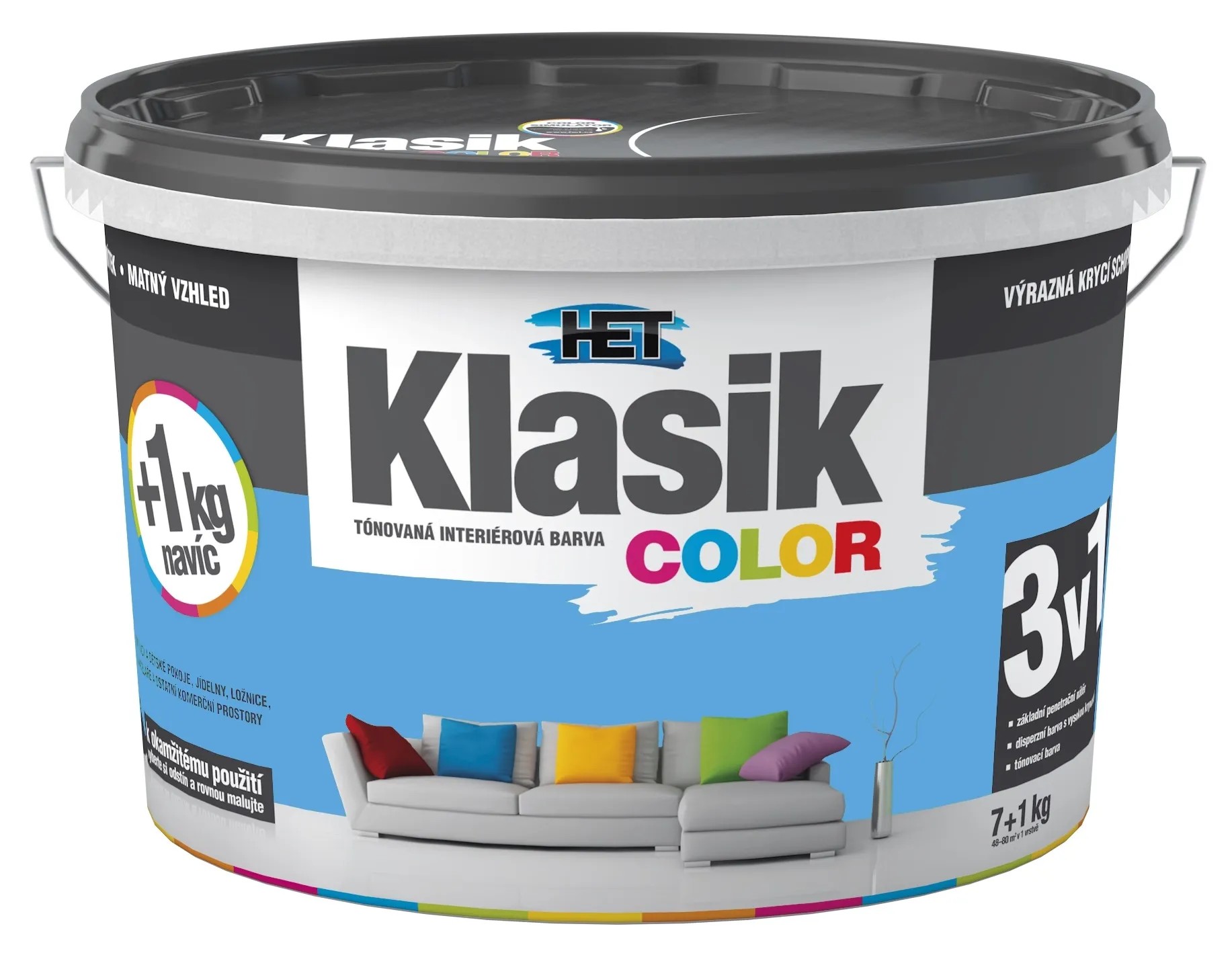 Tónovaná interiérová disperzní otěruvzdorná barva HET Klasik COLOR je nejoblíbenější barva na trhu. Je ideální pro obývací a komerční prostory, dětské pokoje, jídelny, chodby, kanceláře, prodejní prostory a další.
