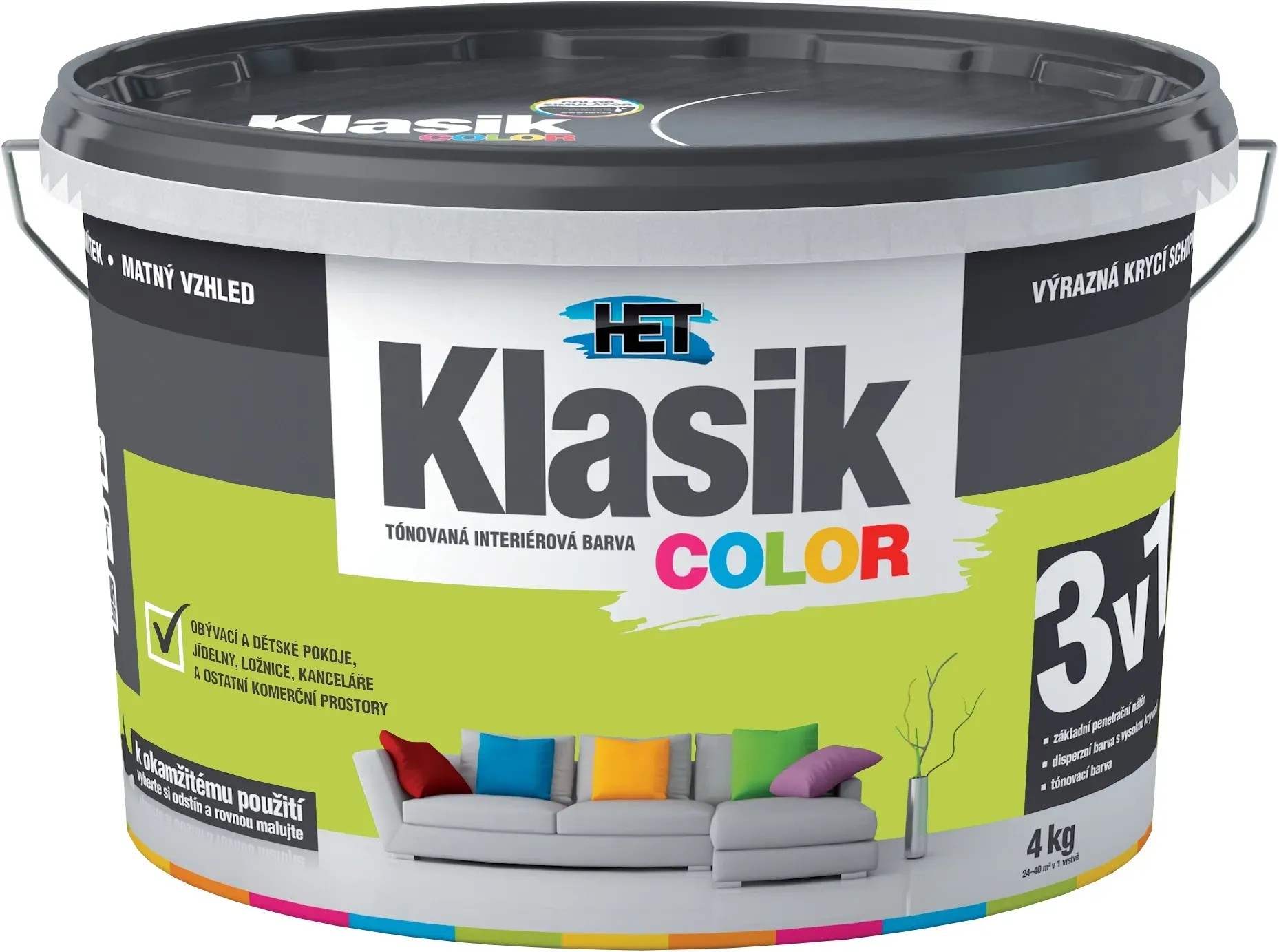 Tónovaná interiérová disperzní otěruvzdorná barva HET Klasik COLOR je nejoblíbenější barva na trhu. Je ideální pro obývací a komerční prostory, dětské pokoje, jídelny, chodby, kanceláře, prodejní prostory a další.
