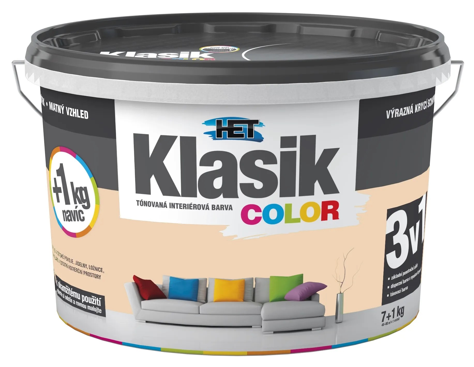 Tónovaná interiérová disperzní otěruvzdorná barva HET Klasik COLOR je nejoblíbenější barva na trhu. Je ideální pro obývací a komerční prostory, dětské pokoje, jídelny, chodby, kanceláře, prodejní prostory a další.