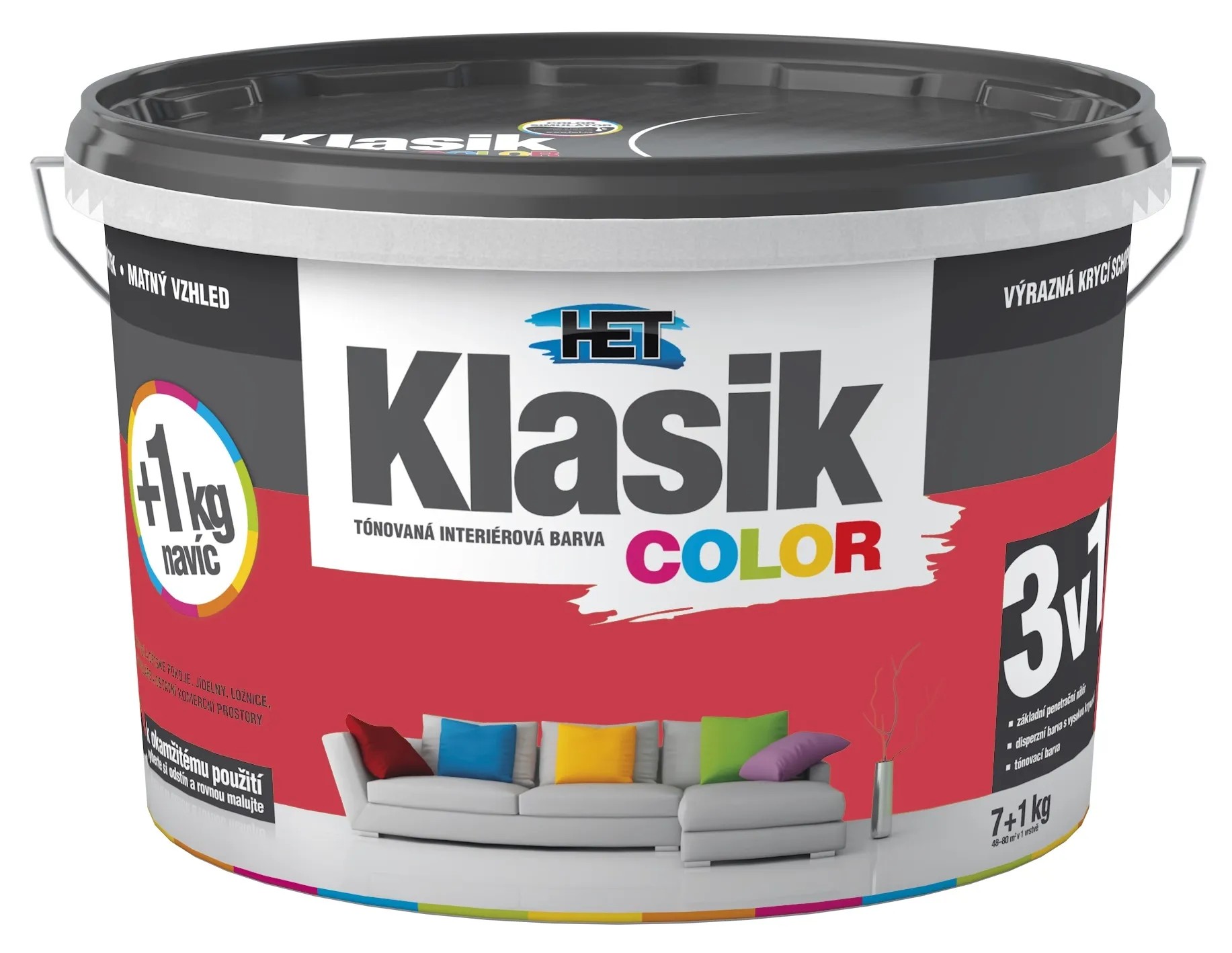 Tónovaná interiérová disperzní otěruvzdorná barva HET Klasik COLOR je nejoblíbenější barva na trhu. Je ideální pro obývací a komerční prostory, dětské pokoje, jídelny, chodby, kanceláře, prodejní prostory a další.