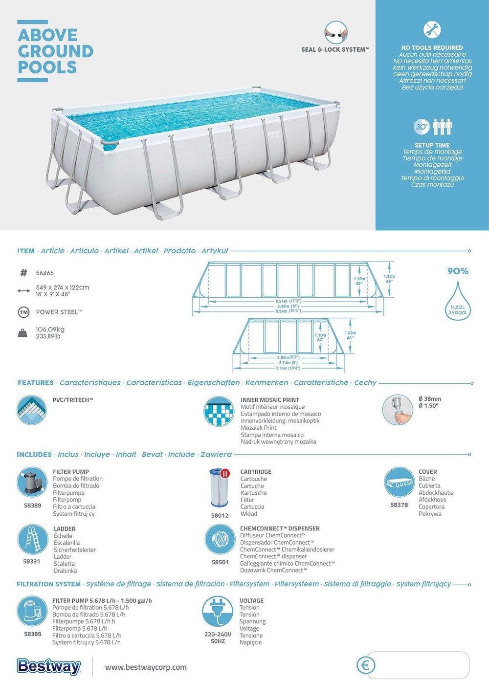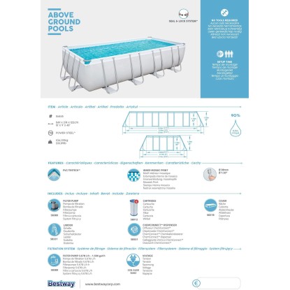 Bazén je dodáván včetně mnoha příslušenství, takže zábavě již nic nestojí v cestě. Filtrační čerpadlo s výkonem 5 678 l/h (cca 0,00158 m3/s) udržuje vodu v bazénu čistou. Bezpečnostní žebřík umožňuje snadný vstup a plachta chrání bazén před nečistotami.