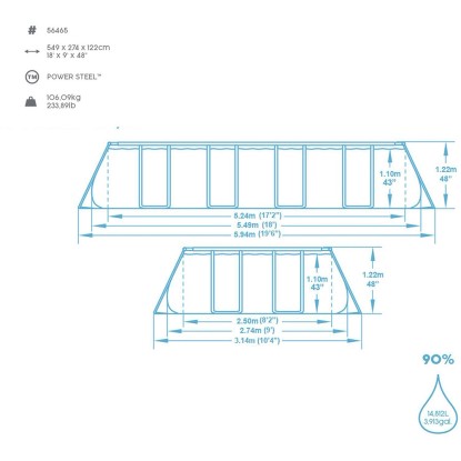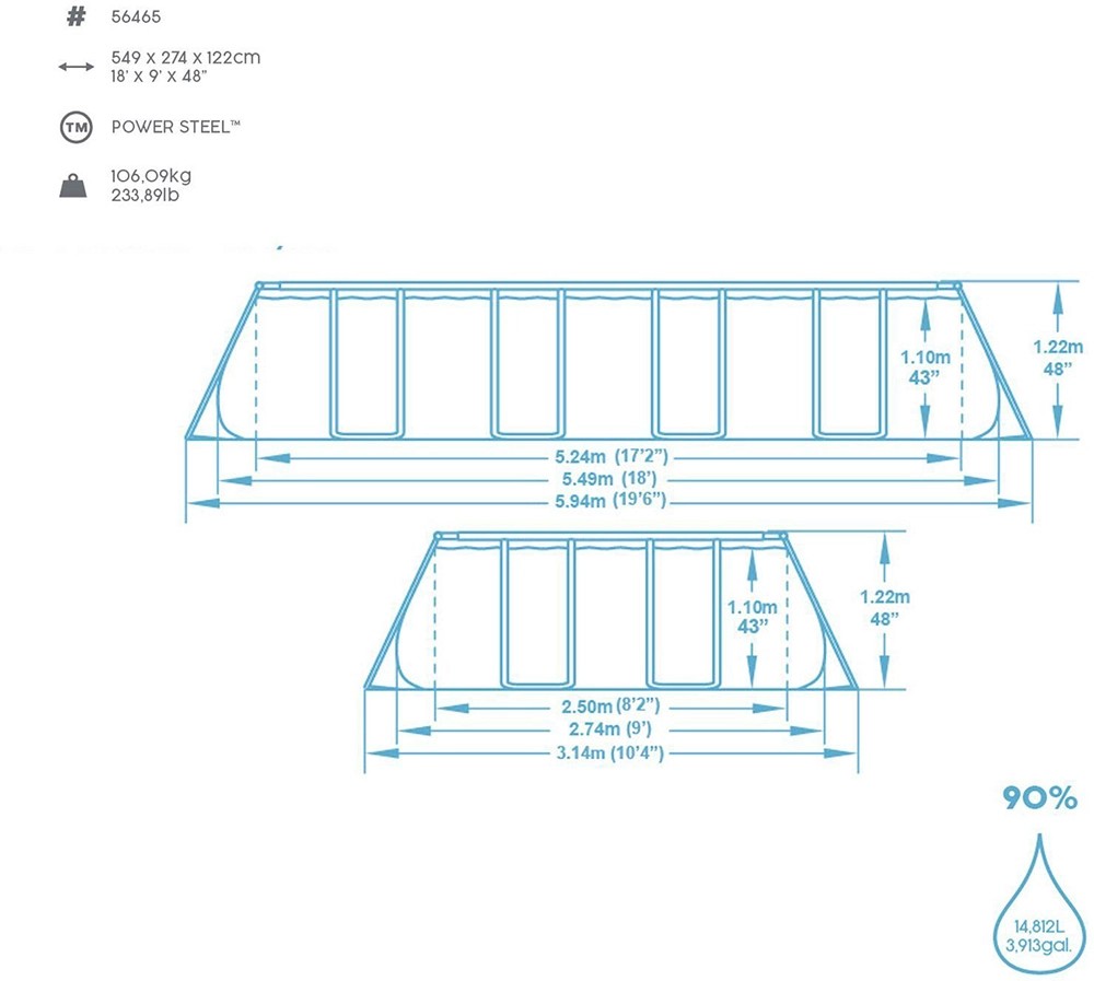 Díky rozměrům 549 x 274 cm (D x Š) nabízí bazén s ocelovým rámem dostatek prostoru pro mnoho osob. Při naplnění bazénu z 90 % pojme až 14 812 l vody. Montáž je rychlá a nevyžaduje žádné nářadí. Bazén je vybaven vypouštěcím ventilem s adaptérem na zahradní hadici, abyste jej mohli vypustit ještě snadněji.