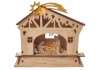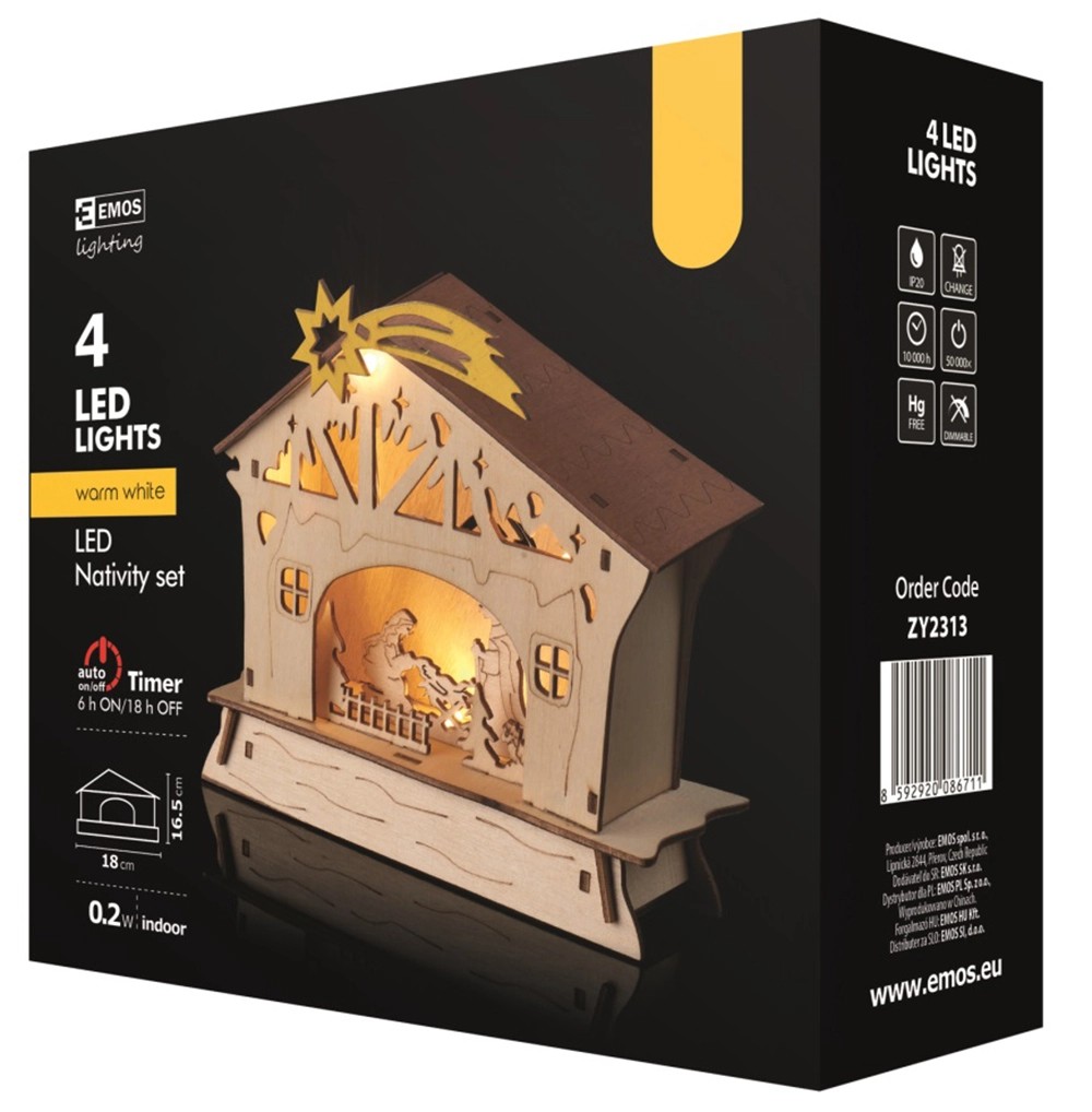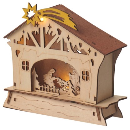 Svítící betlém k postavení se 4 LED 3 V v teplé bílé barvě a časovačem. Se 3 režimy svícení: svítí stále, 6 hodin zapnuto/18 hodin vypnuto a vypnutu. Vhodný pouze do interiéru, stupeň krytí IP20. K postavení. Na 2 baterie AA. Baterie nejsou součástí balení, nutno dokoupit zvlášť.