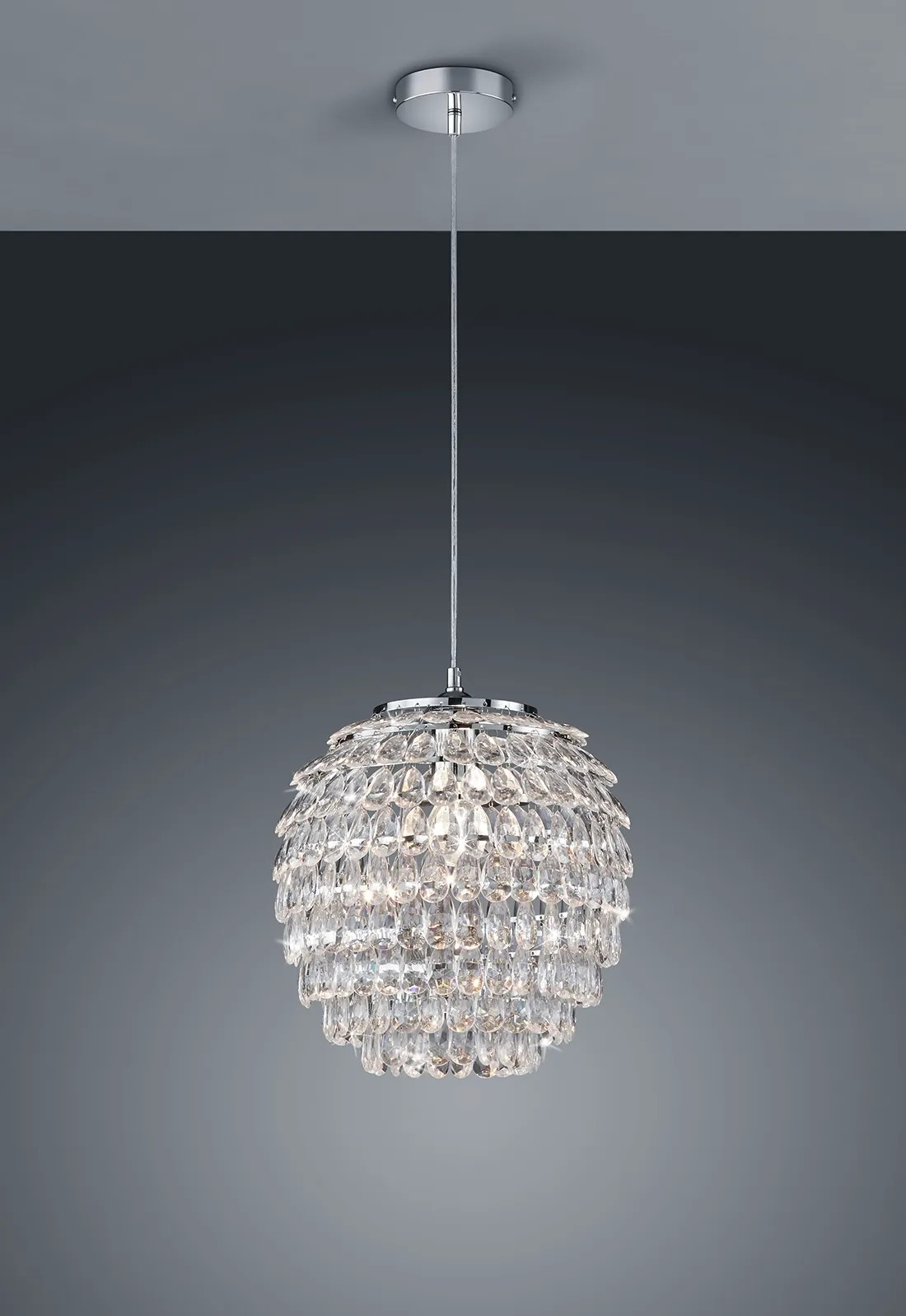 Reality závěsné svítidlo Petty (chrom/čirý plast) o průměru 35 cm a výšce 160 cm. Vhodné pro 1 žárovku E27 max. 60 W 230 V 50 Hz. Třída ochrany IP20.