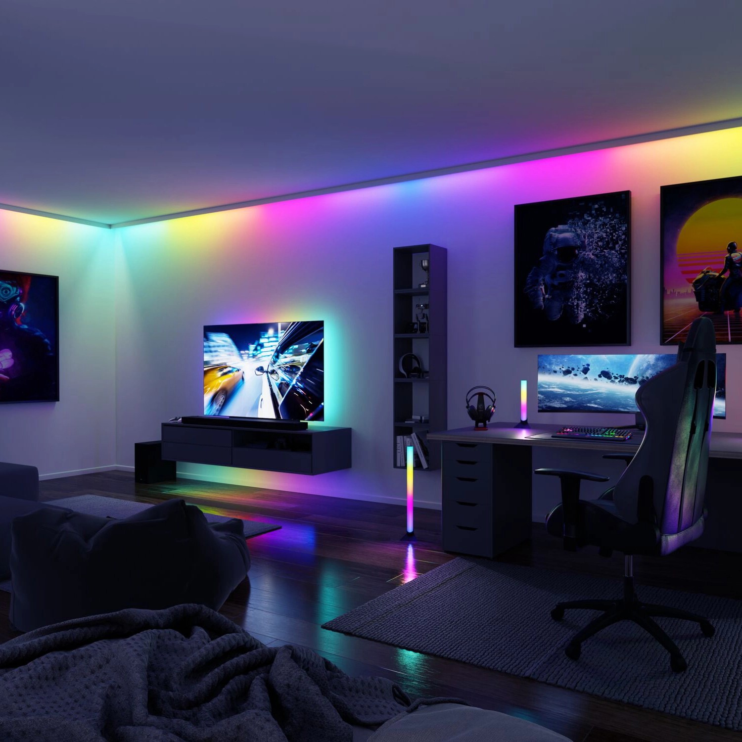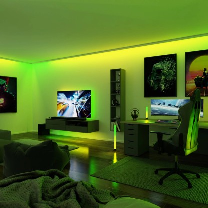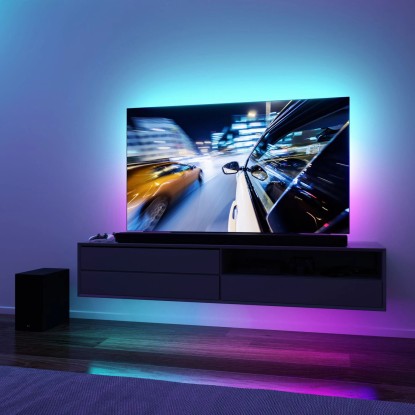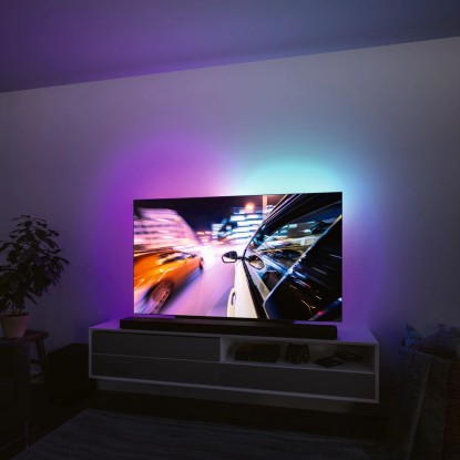 Paulmann LED pásek EntertainLED poskytuje třístranné osvětlení za televizorem. Ambient Light je vhodný pro televizory s uhlopříčkou obrazovky 55". LED pásky vytvářejí stylové TV osvětlení s klidnými nebo dynamickými změnami barev. LED pásky dovedně uspořádají domácí zábavu a herní oblasti.