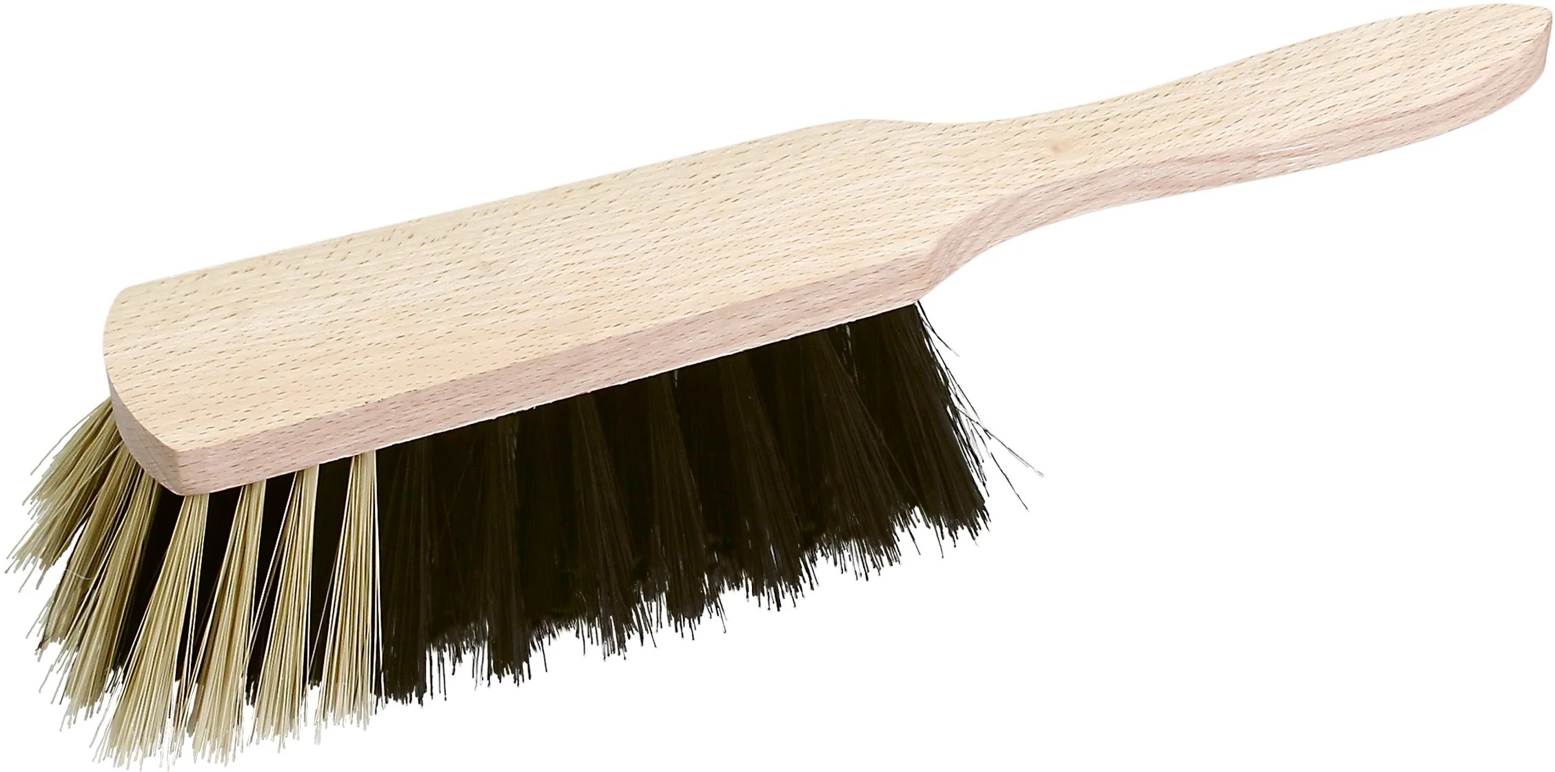 Ruční smeták má dřevěné nelakované těleso a neštěpená syntetická vlákna.