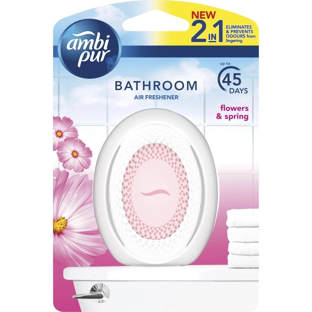 Ambi Pur Bathroom Flower & Spring přinese do vaší koupelny příjemnou svěží vůni. Osvěžovač odstraňuje ze vzduchu pachy a současně zabraňuje jejich usazování na měkkých površích, jako jsou ručníky, vany či sprchové závěsy.