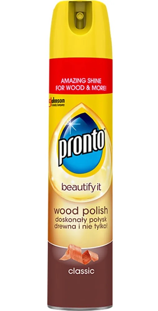 Sprej na dřevo Pronto poskytuje vysokou a přirozenou ochranu všem dřevěným předmětům s povrchovou úpravou ve vaší domácnosti. Pronto sprej na dřevo Classic zbavuje dřevěné povrchy prachu, otisků prstů a alergenových stop, a dodává jim perfektní lesk.