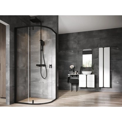 Třídílný čtvrtkruhový sprchový kout Nexty v černém provedení a s výplní z čirého skla s ochrannou vrstvou Ravak AntiCalc. Otočný pivotový systém otevírání. Otočitelný výrobek pro levou i pravou variantu.