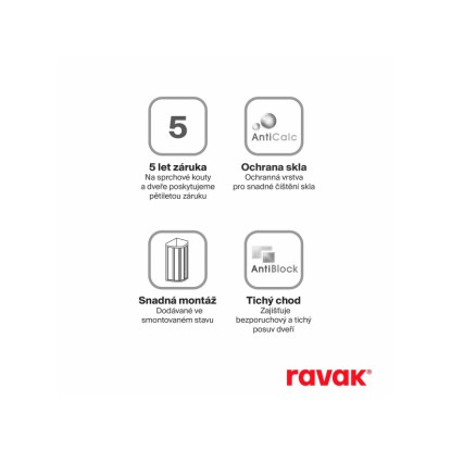 Sprchový kout tvoří dva pevné rovné a čtyři posuvné díly. Možnost přizpůsobení stavebnímu otvoru pomocí nastavovacích profilů NPS. Výrobek je dodáván ve smontovaném stavu, stačí přišroubovat ke zdi a utěsnit. Montuje se do obloženého rohu koupelny na vaničky RAVAK Ronda, Elipso, Elipso Pro, Elipso Pro Flat, Elipso Pro Chrome nebo přímo na podlahu se zabudovaným odtokovým žlabem či podlahovou vpustí. Montáž výrobku zvládne jeden člověk za pouhou hodinu.