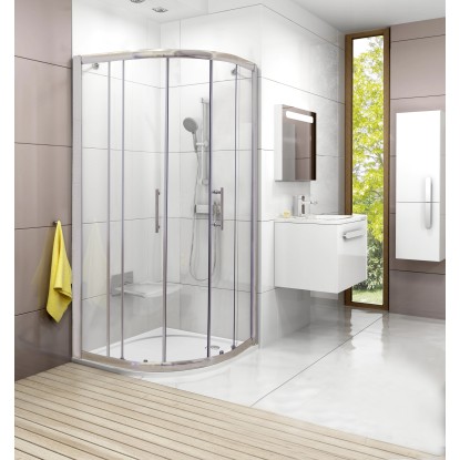 Čtyřdílný čtvrtkruhový sprchový kout v provedení lesklý chrom. Dveře sprchového koutu jsou posuvné a opatřeny průhledným bezpečnostním sklem s tloušťkou 5 mm. Výrobek se montuje do obloženého rohu koupelny na lité vaničky RAVAK Elipso Pro, Elipso Pro Chrome, Elipso Pro Flat nebo přímo na podlahu se zabudovaným odtokovým žlabem či podlahovou vpustí.