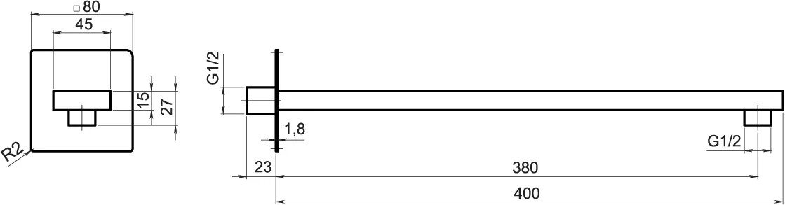 Hranaté rameno pevné sprchy RAM405,0 pro podomítkové zapojení. Délka ramene je 400 mm.