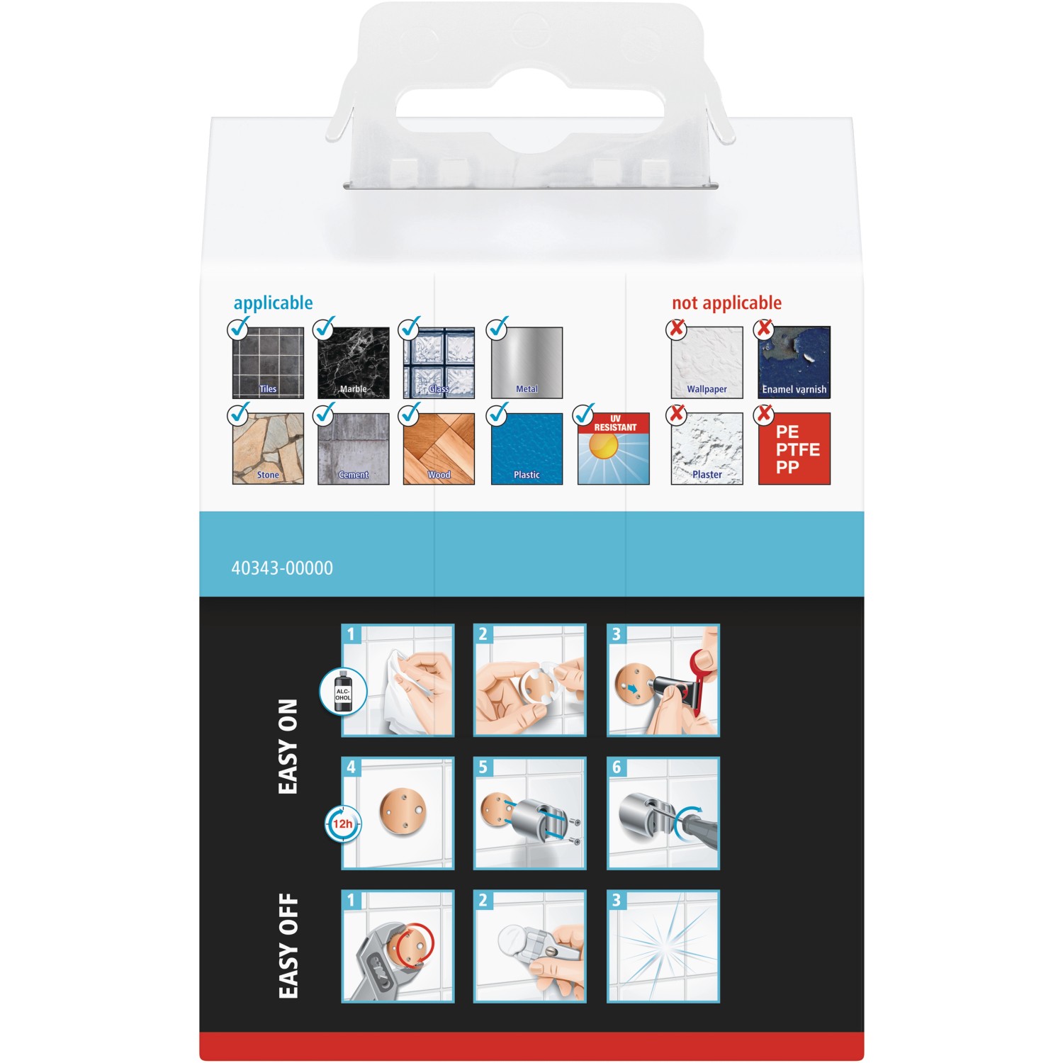 K připevnění se používá lepidlo. Vrtání není zapotřebí a nedojde ani k žádnému poškození stěn nebo obkladů. Lepidlo zasychá za 12 hodin. Držák můžete rychle a beze stopy demontovat, kdykoli chcete. S novým adaptérem BK27 ho můžete také opět připevnit na jiném místě.