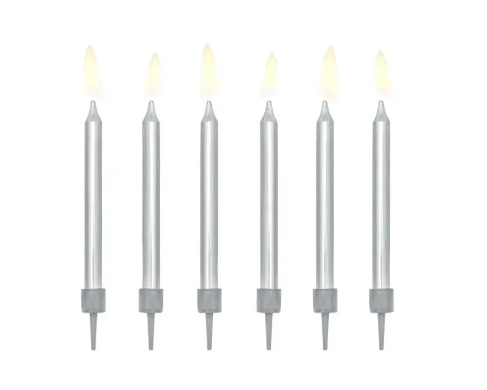 Stříbrné svíčky jsou ideální ozdobou každého dortu. Balení obsahuje 6 ks svíček o velikosti 6 cm.