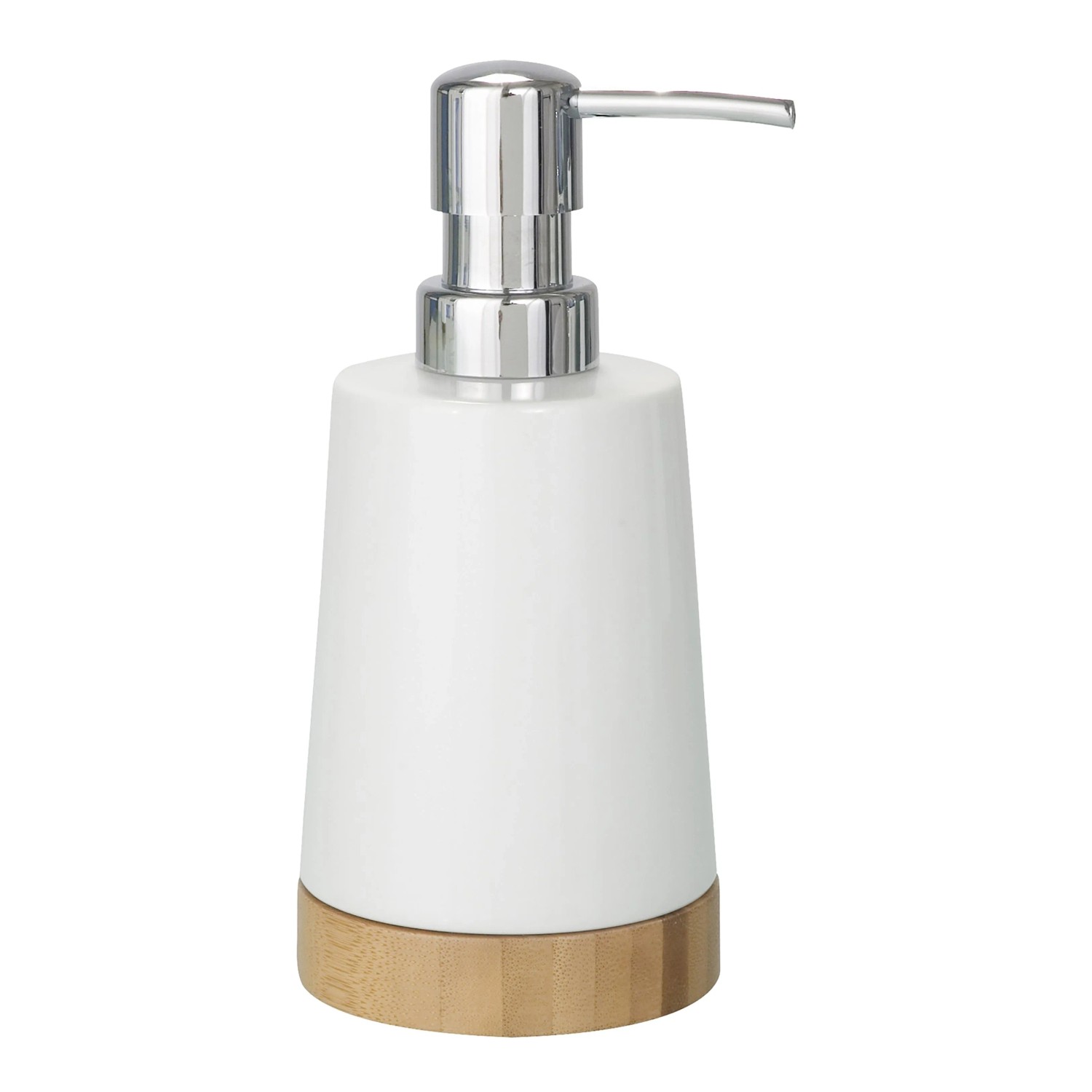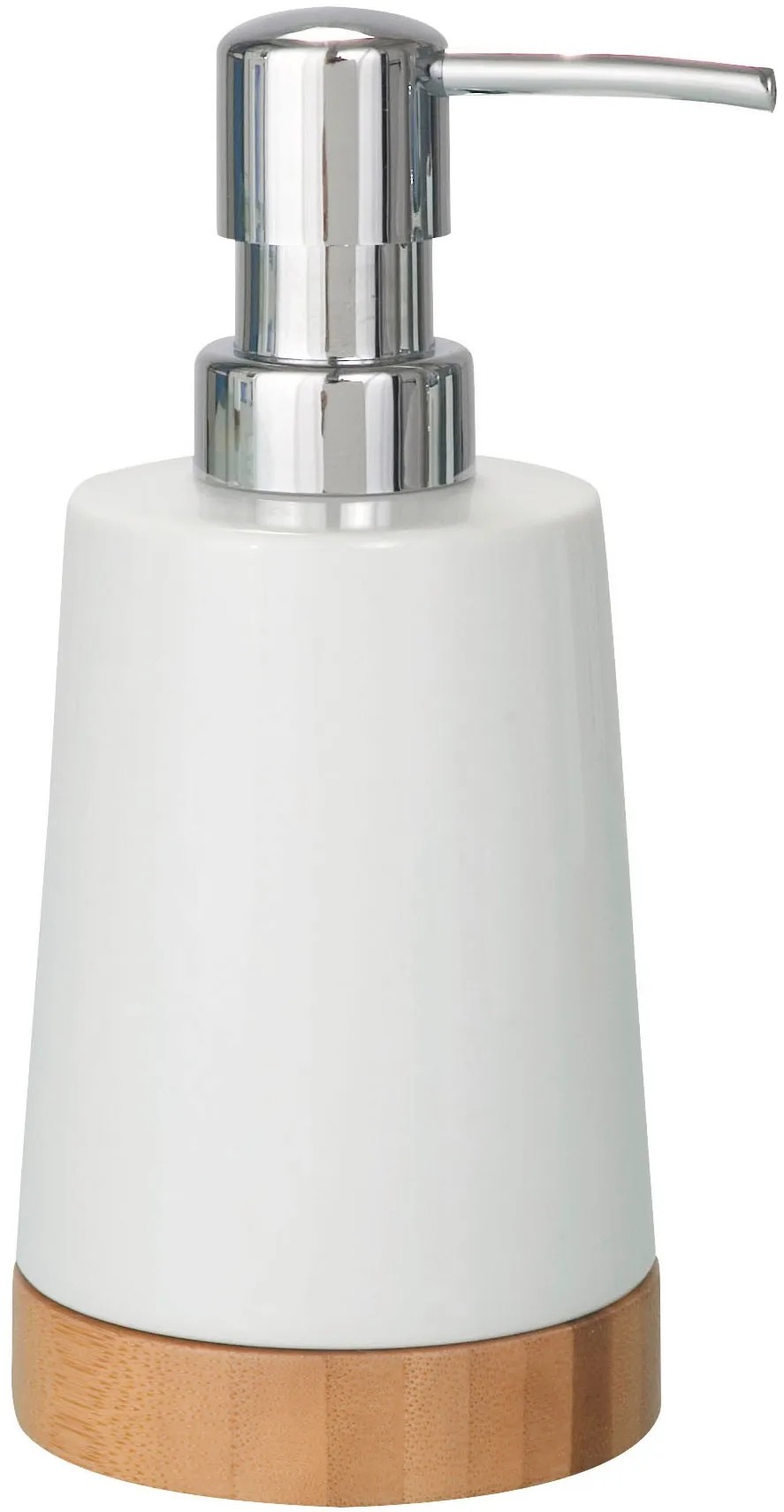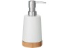 Volně stojící dávkovač mýdla v kombinaci porcelánu a dřeva, moderní a jednoduchý design. Velmi trendy.