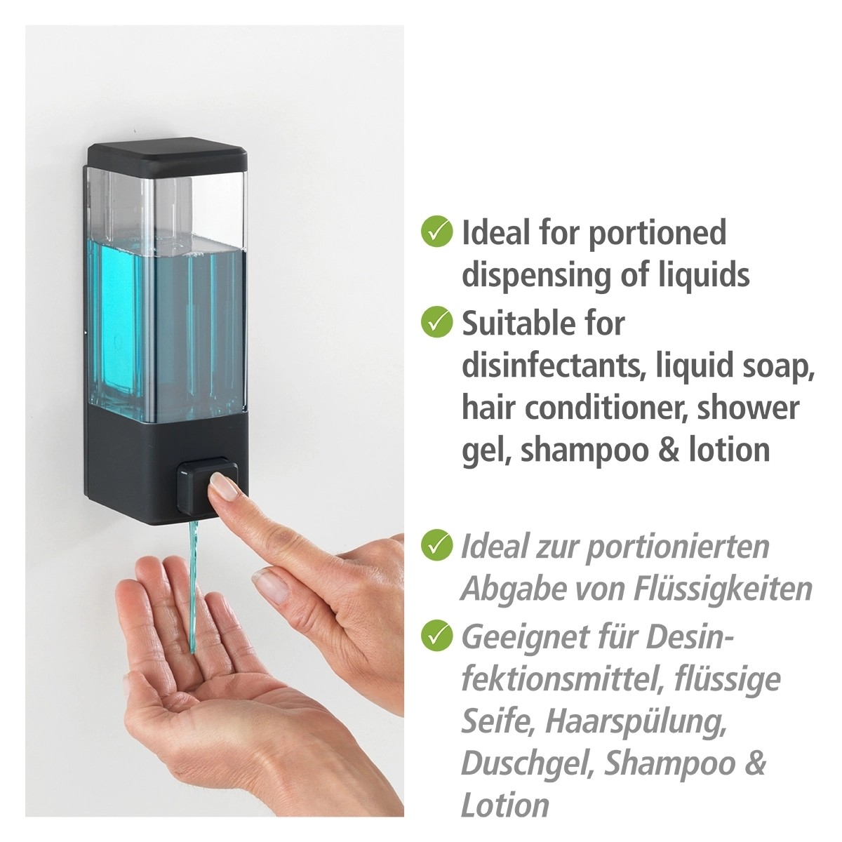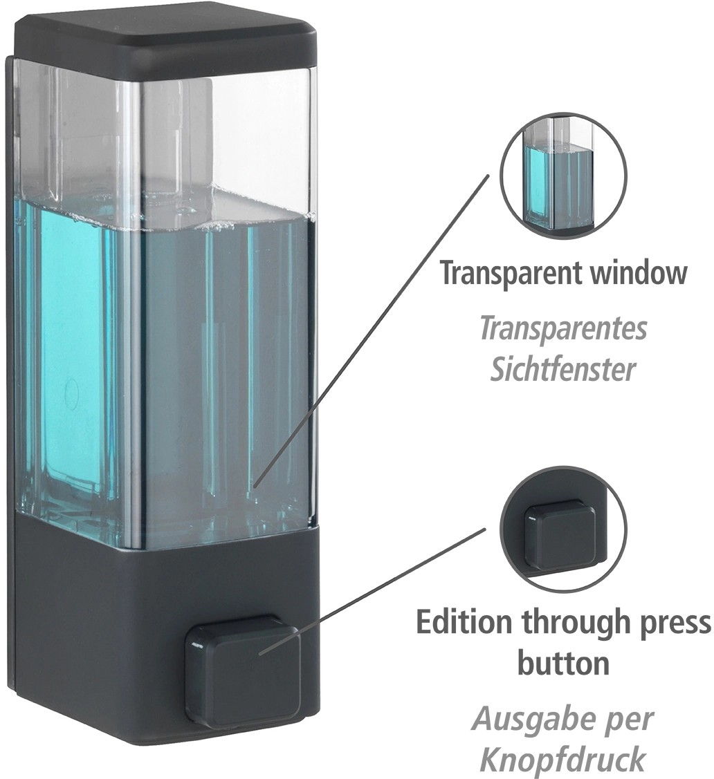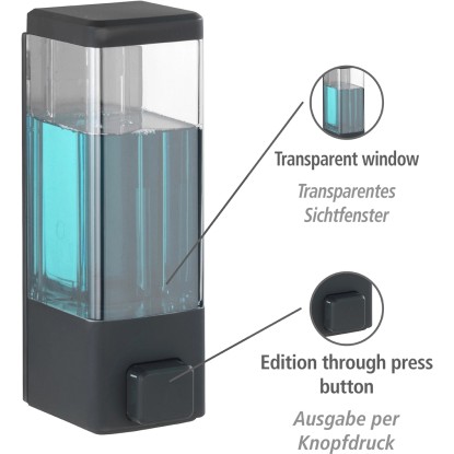 Více hygieny v domácnosti se značkou Wenko. Zásobník Istres je vyroben z plastu a je určen pro dávkování kapalin jako např. dezinfekčních prostředků, tekutých mýdel, kondicionérů, sprchových gelů, šamponů a hydratačních krémů. Požadované množství se jednoduše nadávkuje stisknutím tlačítka. Zásobník má kapacitu 320 ml. Dávkovač nekape, lze jej snadno čistit a jednoduše doplnit. Díky transparentnímu zásobníku lze kdykoliv zjistit zbývající množství.