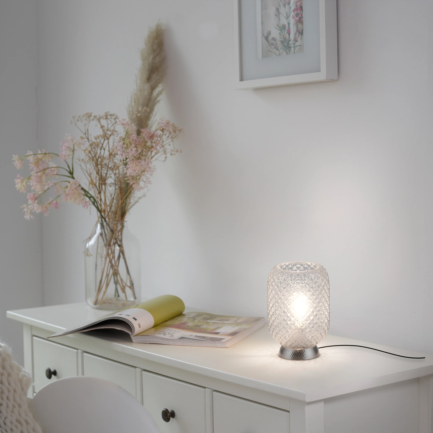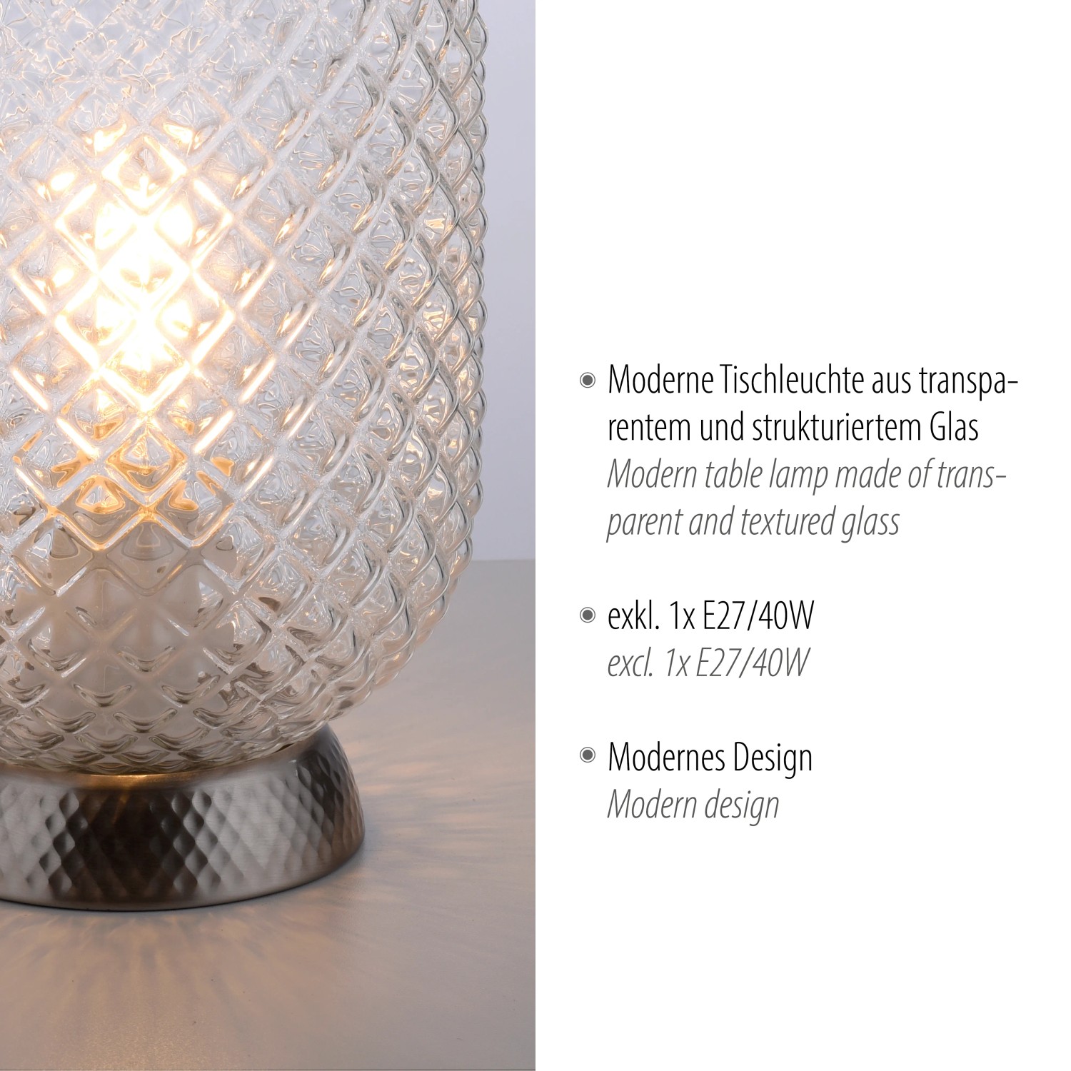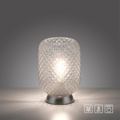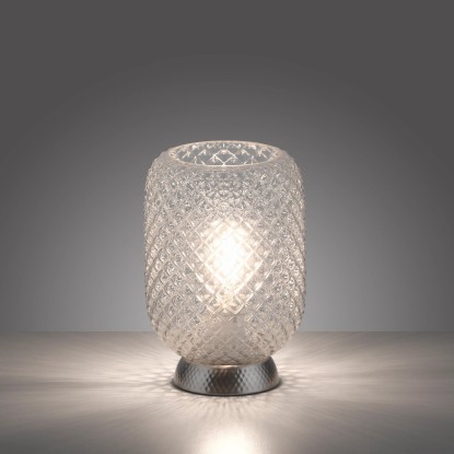Stolní lampa Reishi vytváří zvláštní hru světla přes rýhované sklo. Svítidlo se ovládá pomocí kabelového vypínače. Malá stolní lampa má naprosto dekorativní efekt.