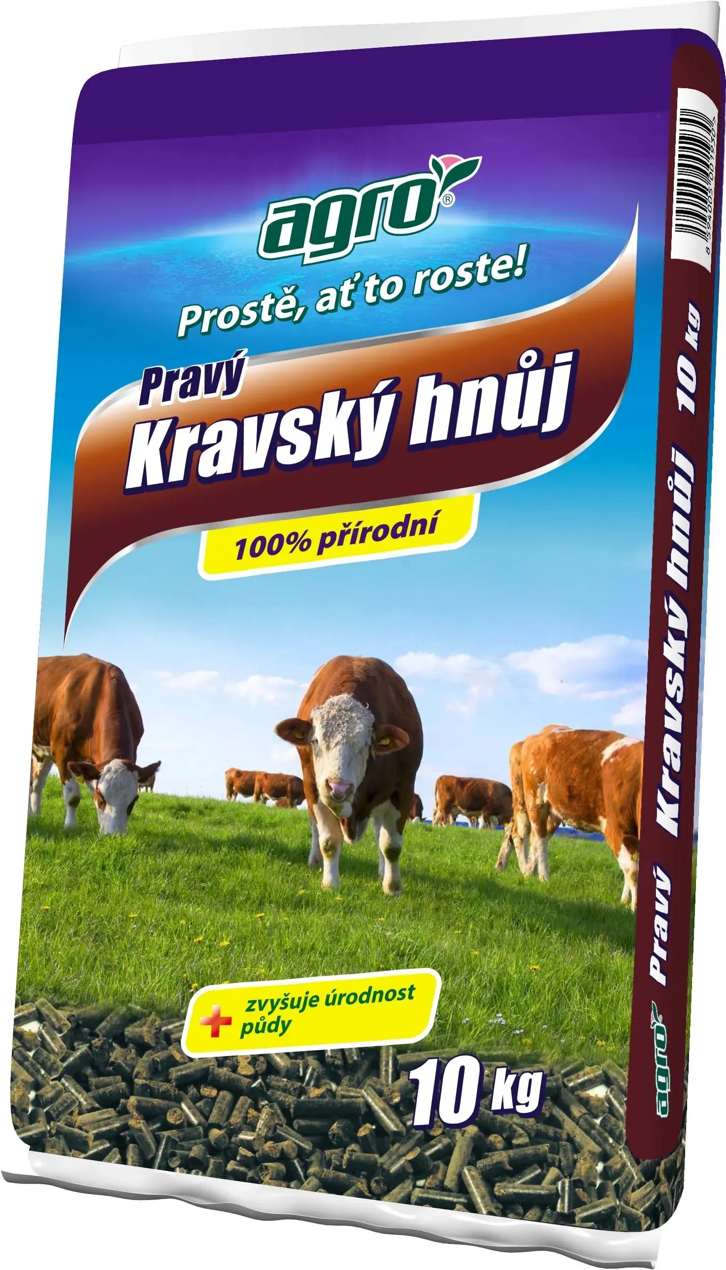 AGRO Pravý kravský hnůj je organické hnojivo vyráběné z kravského hnoje pomocí procesu sušení a lisování. Granulovaná forma hnojiva usnadňuje manipulaci. Hnojivo používáme k základnímu hnojení před výsadbou rostlin vyžadující organické hnojení (brambory, řepa, celer, brukvovitá, plodová zelenina). Dále jeho použití je vhodné pro vyhnojení květinových záhonů a při přípravě půdy před výsadbou stromů a keřů.