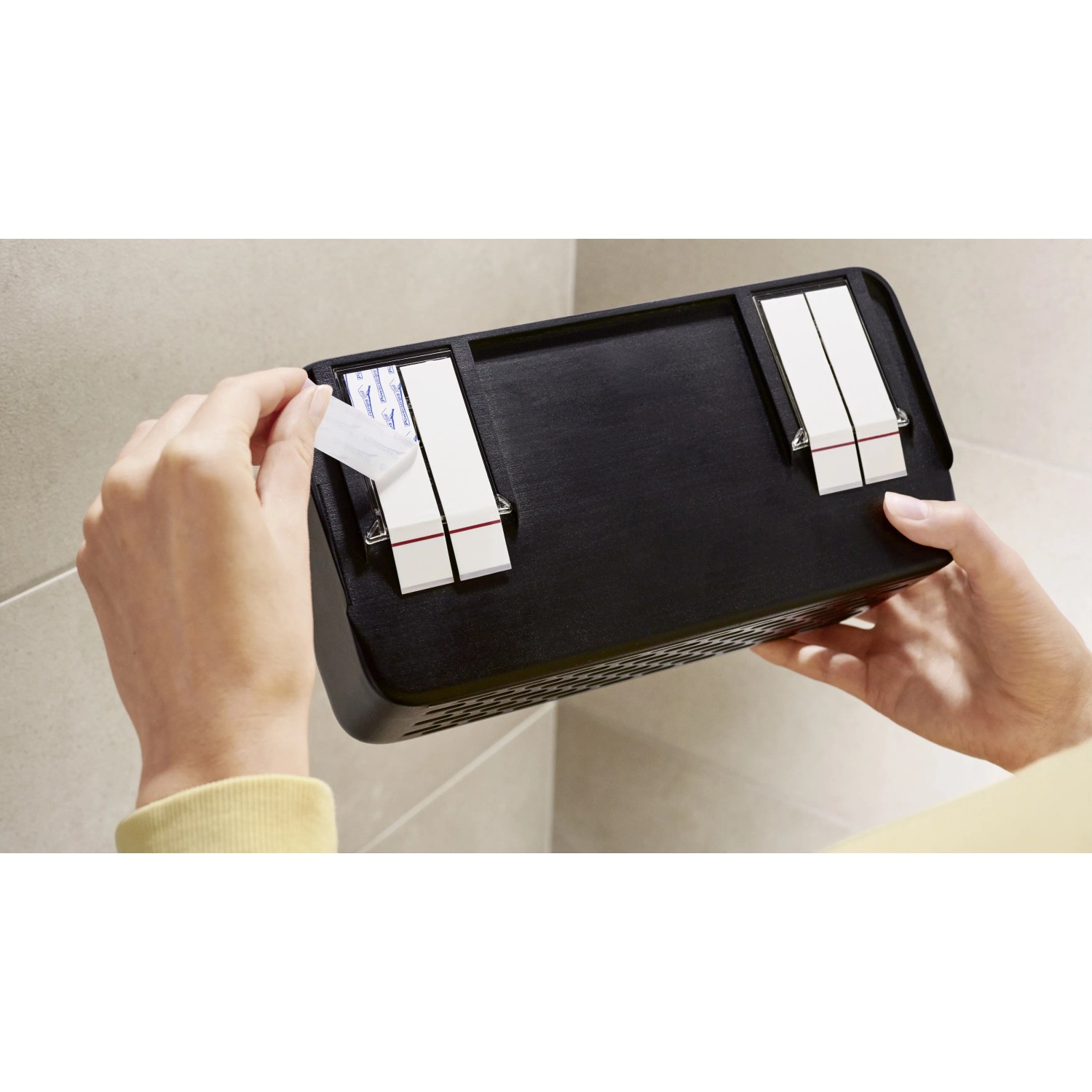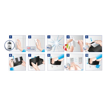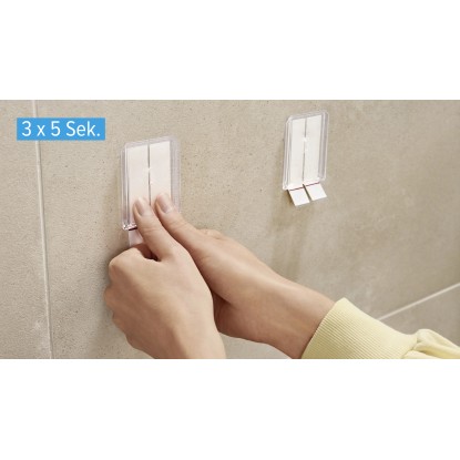 Lepicí proužky tesa Powerstrips Waterproof se hodí zejména pro upevnění předmětů v mokrých prostorách, snadno se odstraňují a nezanechávají stopy. Lze je znovu namontovat pomocí doplňovacích pásků tesa Powerstrips Waterproof XL.