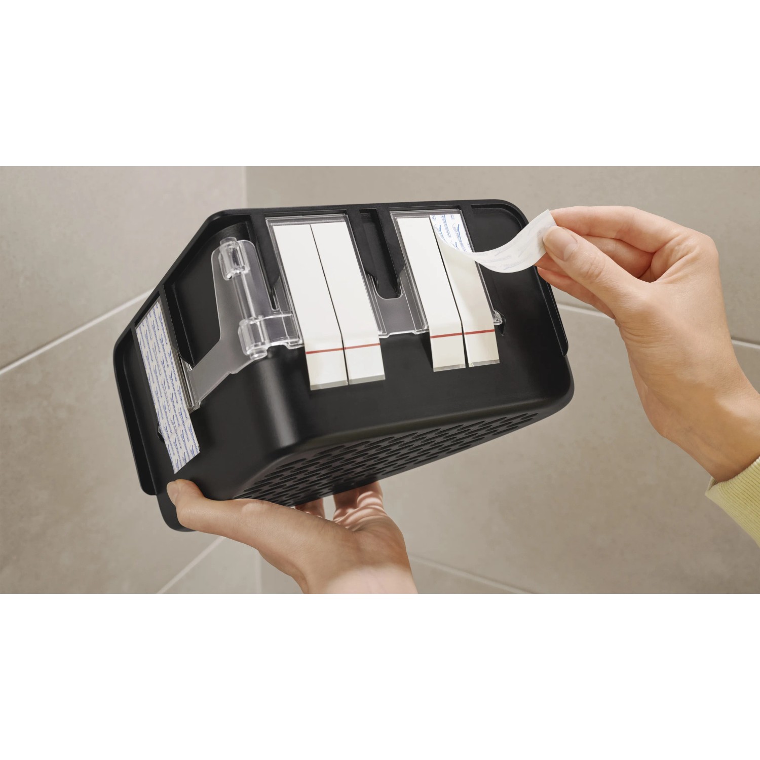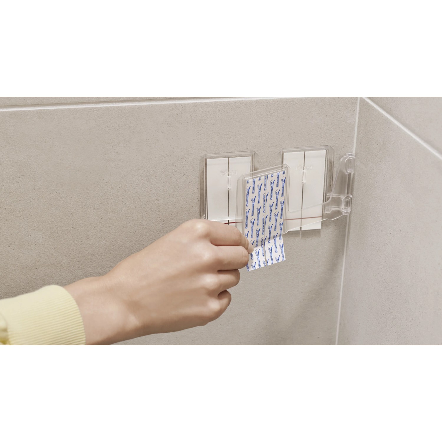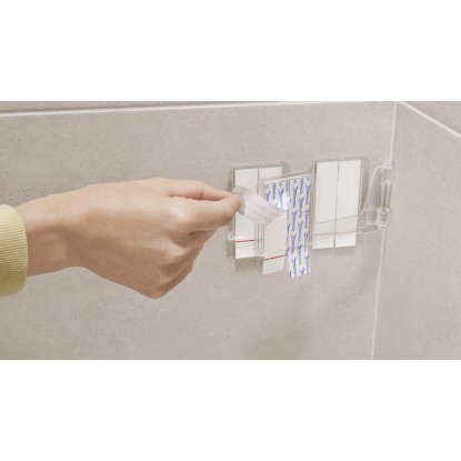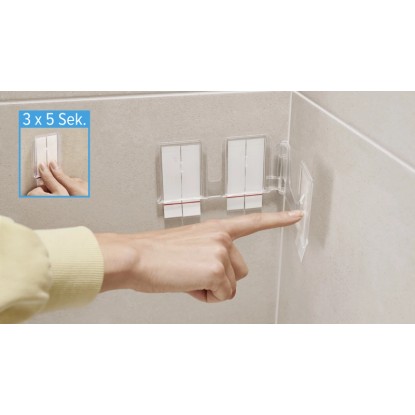 Lepicí proužky tesa Powerstrips Waterproof se hodí zejména pro upevnění předmětů v mokrých prostorách, snadno se odstraňují a nezanechávají stopy. Lze je znovu namontovat pomocí doplňovacích pásků tesa Powerstrips Waterproof XL.