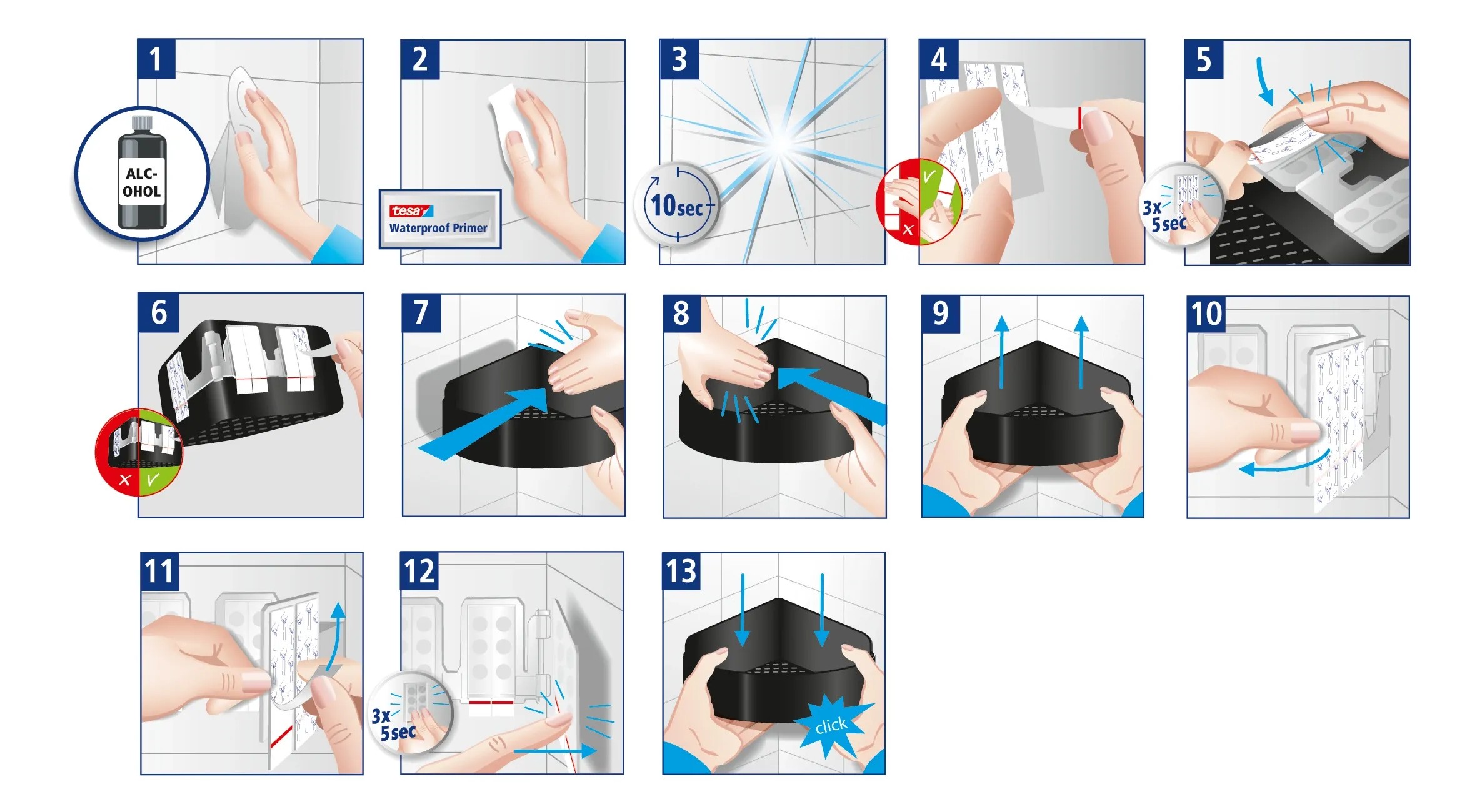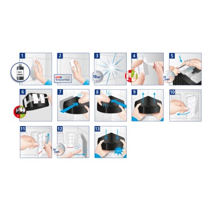 Obsah balení výrobku: 1x košík do sprchy, 1x základnová deska, 6x proužek, 2x hadřík na primer, 1x návod