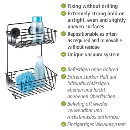 Trendy koupelnová série Vacuum-Loc Black z matně lakované oceli nabízí velký výběr prostorných nástěnných polic, háčků a koupelnových doplňků, které lze jednoduše zavěsit do adaptéru a přímo naložit. Unikátní vakuový systém, který umožňuje upevnění bez vrtání a bez použití nářadí, pevně drží na neporézních, rovných a mírně nerovných površích. Lze jej přemístit a odstranit bez zanechání stop. Moderní dvoupatrový regál Vacuum-Loc Bari nabízí dekorativní prostor pro všechny pečující produkty, které jsou okamžitě k dispozici a hodí se téměř do každé koupelny.