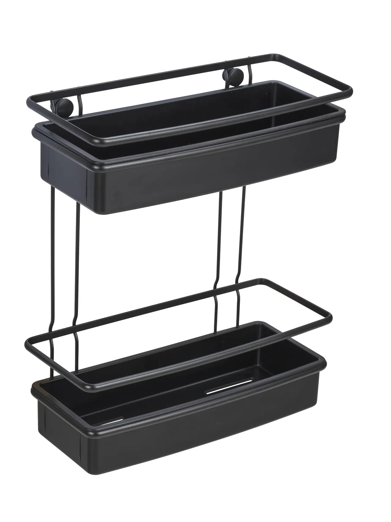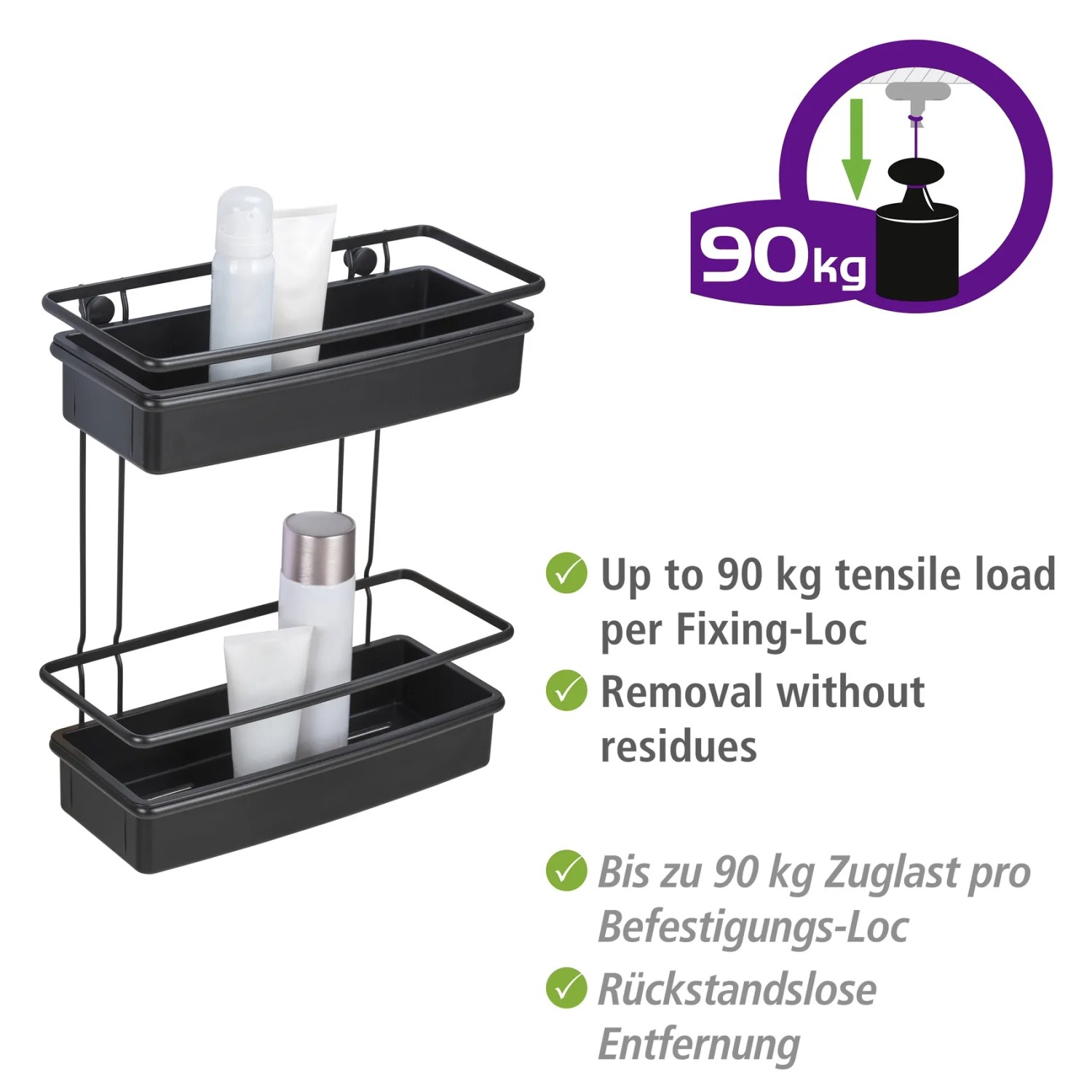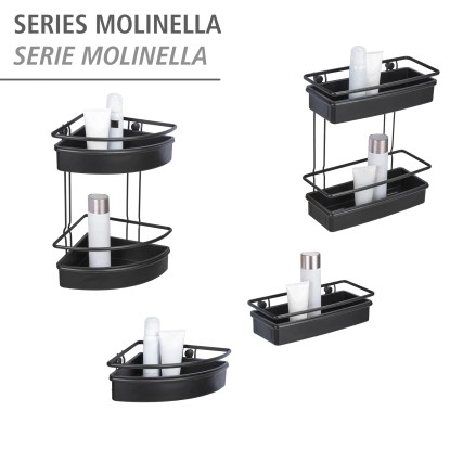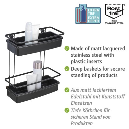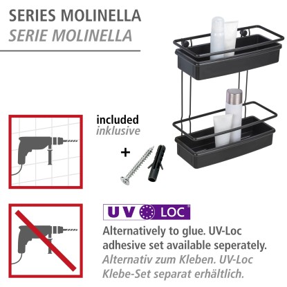 Dvoupatrová koupelnová police Wenko Molinella z černého plastu je perfektním řešením pro vytvoření pořádku a elegance ve vaší koupelně. Koupelnová police Molinella se dvěma patry nabízí dostatek místa pro vaše koupelnové a toaletní potřeby. Extra hluboký košík zajišťuje stabilitu lahví. Police je navíc kompatibilní s jedinečným lepicím systémem UV-Loc značky Wenko (není součástí balení), který umožňuje rychlou montáž bez nutnosti vrtání. Otvory ve spodní části umožňují snadné odtékání vody.