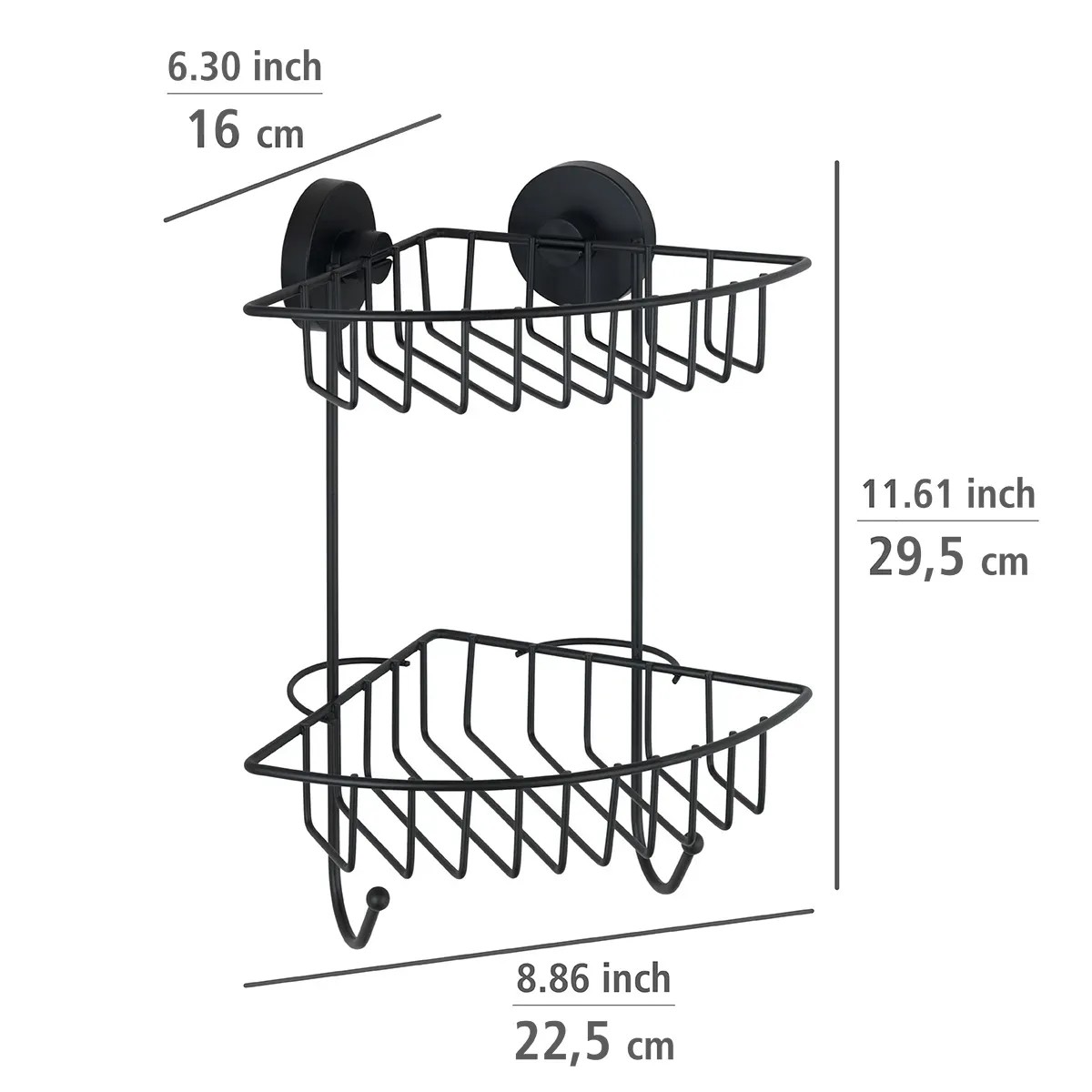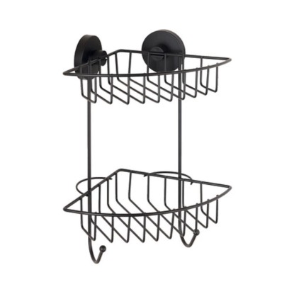 Trendy koupelnová série Vacuum-Loc Black z matně lakované oceli nabízí velký výběr prostorných nástěnných polic, háčků a koupelnových doplňků, které lze jednoduše zavěsit do adaptéru a přímo naložit. Unikátní vakuový systém, který umožňuje upevnění bez vrtání a bez použití nářadí, pevně drží na neporézních, rovných a mírně nerovných površích. Lze jej přemístit a odstranit bez zanechání stop. Moderní rohový dvoupatrový regál Vacuum-Loc Bari nabízí dekorativní prostor pro všechny pečující produkty, které jsou okamžitě k dispozici a hodí se téměř do každé koupelny.