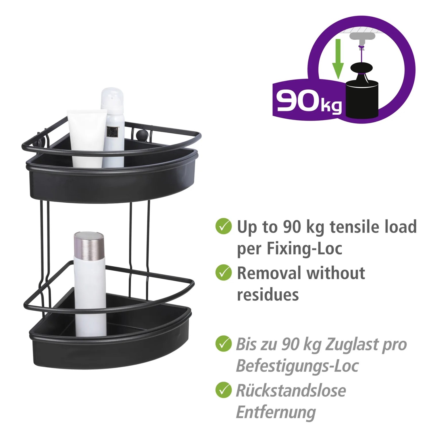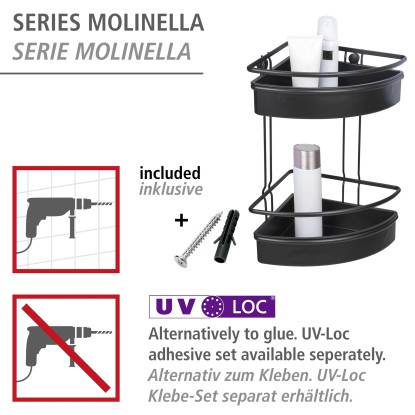 Dvoupatrová koupelnová police Wenko Molinella z černého plastu je perfektním řešením pro vytvoření pořádku a elegance ve vaší koupelně. Koupelnová police Molinella se dvěma patry nabízí dostatek místa pro vaše koupelnové a toaletní potřeby. Extra hluboký košík zajišťuje stabilitu lahví. Police je navíc kompatibilní s jedinečným lepicím systémem UV-Loc značky Wenko (není součástí balení), který umožňuje rychlou montáž bez nutnosti vrtání. Otvory ve spodní části umožňují snadné odtékání vody.