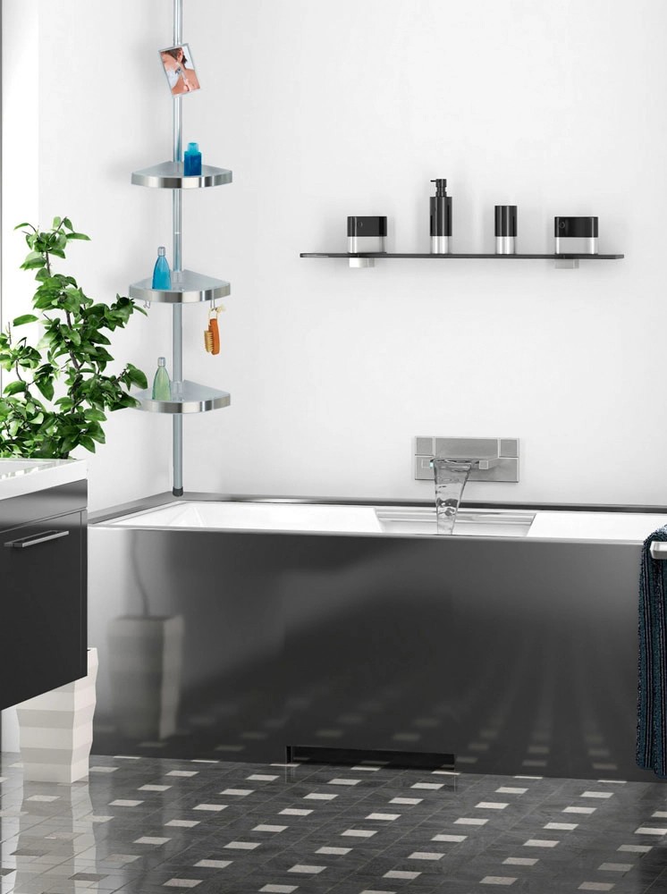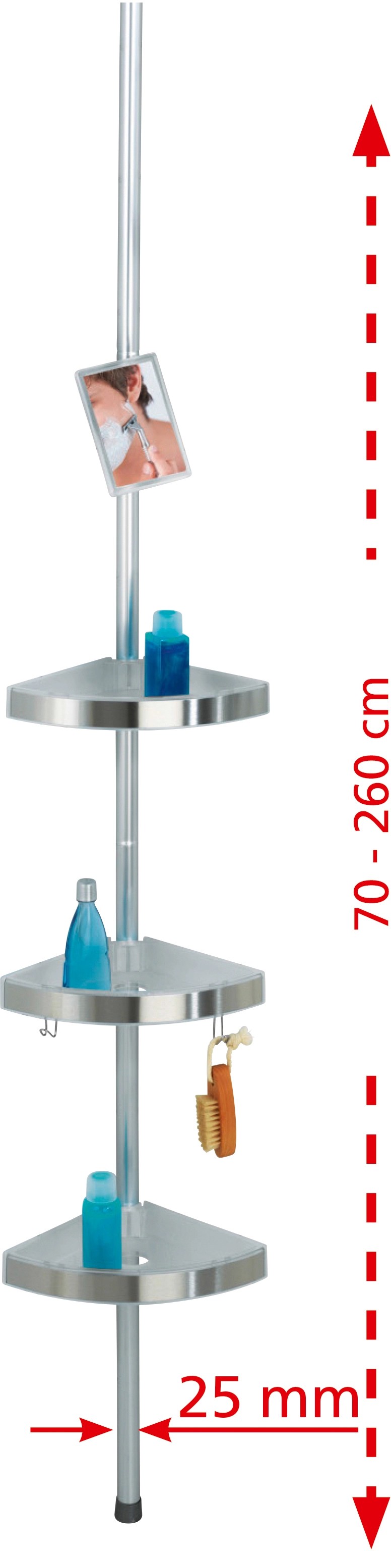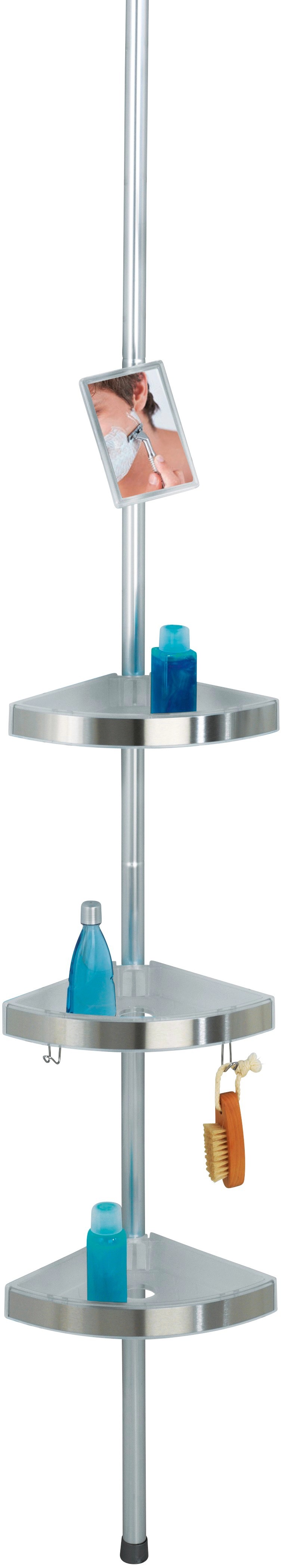 Ať už ve sprchové kabině nebo v rohu vany, teleskopický rohový stojan do sprchy Premium má v koupelně univerzální a dekorativní využití. Regál se 3 výškově nastavitelnými odkládacími plochami z kvalitního plastu poskytuje spoustu místa na sprchové gely, šampony, mýdlo, houby nebo jiné koupelnové doplňky. Rohové odkládací košíky mají velké otvory na šampony uložené nad hlavou a odtok vody. Včetně 2 volně polohovatelných háčků na žínky, houby nebo kartáče. Prémiový sprchový regál je opatřen otočným a výškově nastavitelným zrcadlem z nerozbitného polykarbonátu. Teleskopický regál lze vysunout až na 2,60 m. Teleskopická tyč stříbrné barvy je vyrobena z masivního, nekorodujícího, kvalitního hliníku. Kvalitní nerezové kryty rovněž zaručují špičkovou nerezavějící kvalitu. Montáž tohoto praktického rohového stojanu do sprchy se podaří obratem ruky: Jednoduše se upevní mezi podlahu a strop a je hotovo, zcela bez vrtání a šroubování.