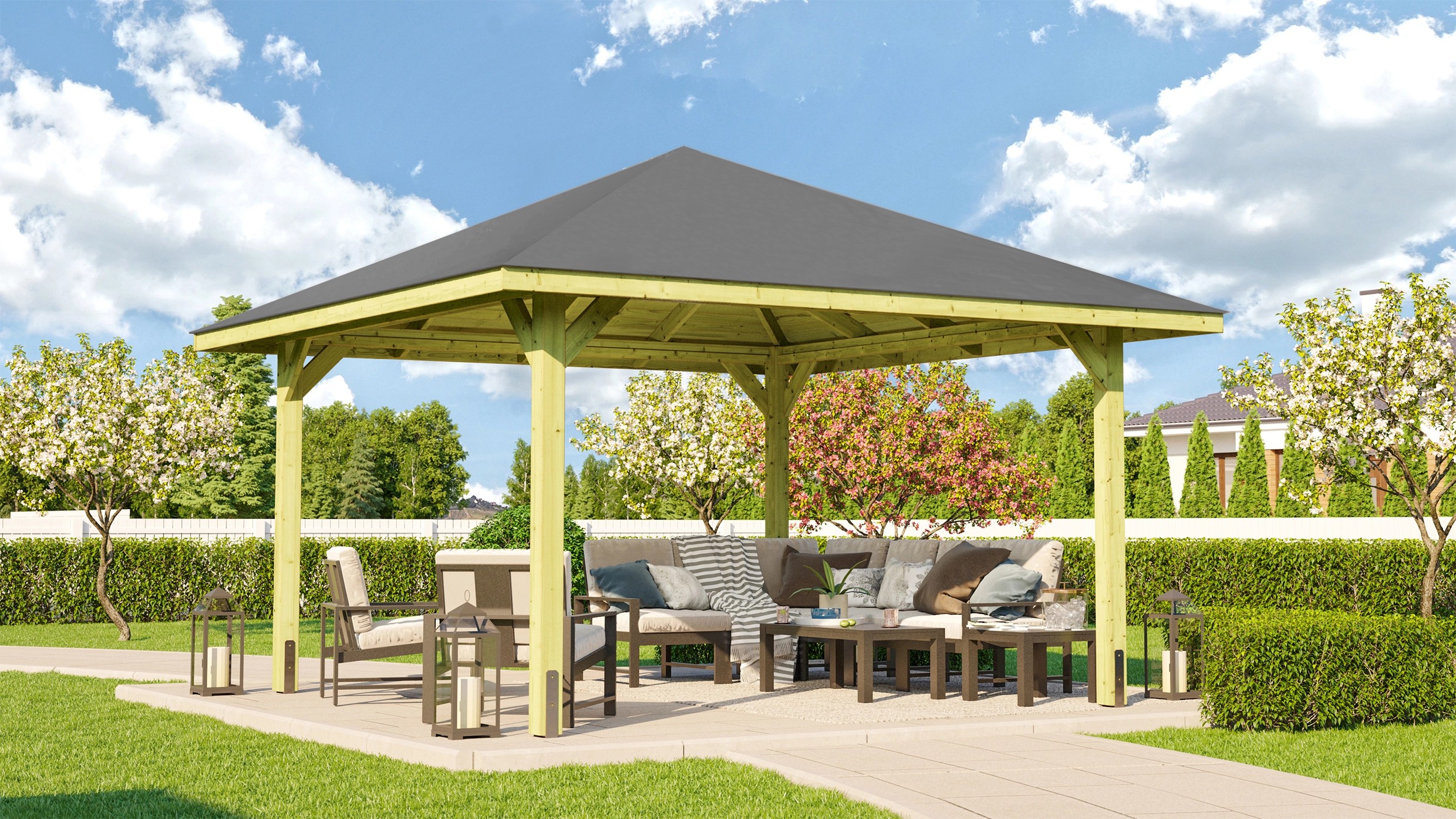 Dřevěný zahradní altán Weka 651 A vám umožní na chvíli vypnout a zapomenou na dění celého dne, ať už při čtení nebo s přáteli a rodinou. Zahradní altány 651 V jsou dodávány ve dvou velikostech vel. 1 - 433 x 433 x 314 cm a vel. 2 - 480 x 480 x 314 cm, buď jako výhodná sada včetně střešních šindelů nebo bez šindelů, pouze s bitumenovou lepenkou pro první pokrytí.