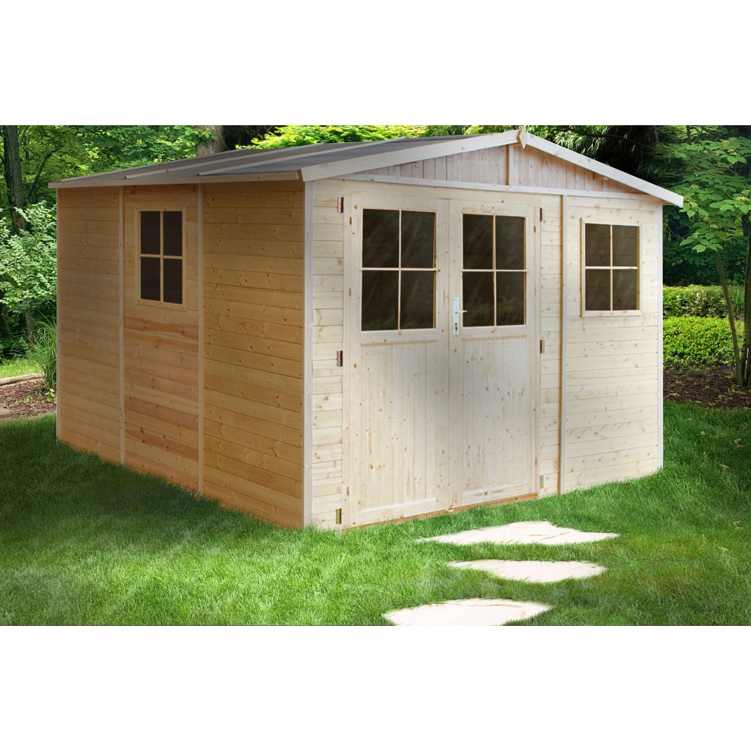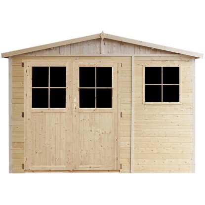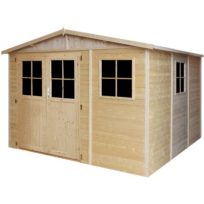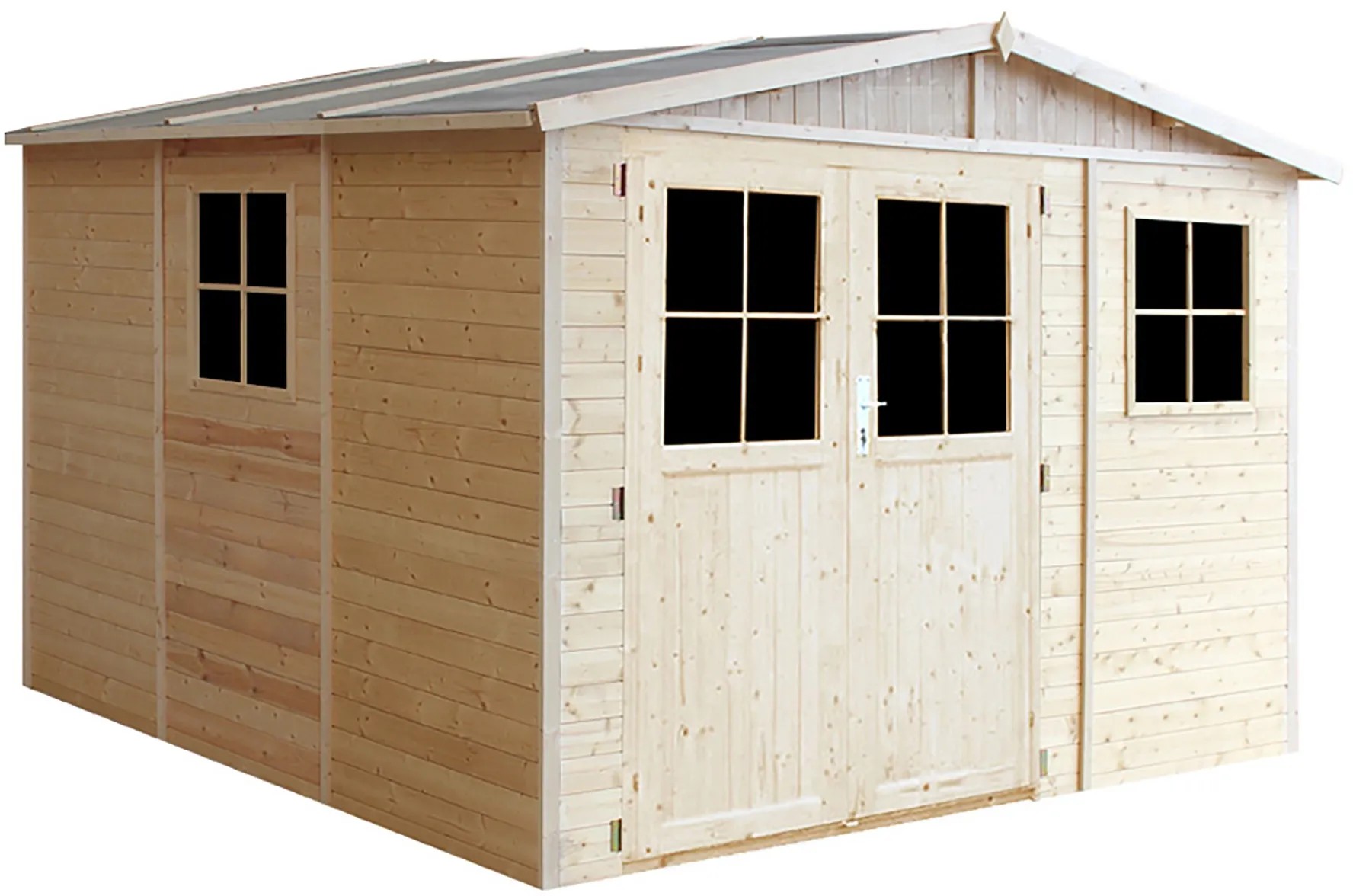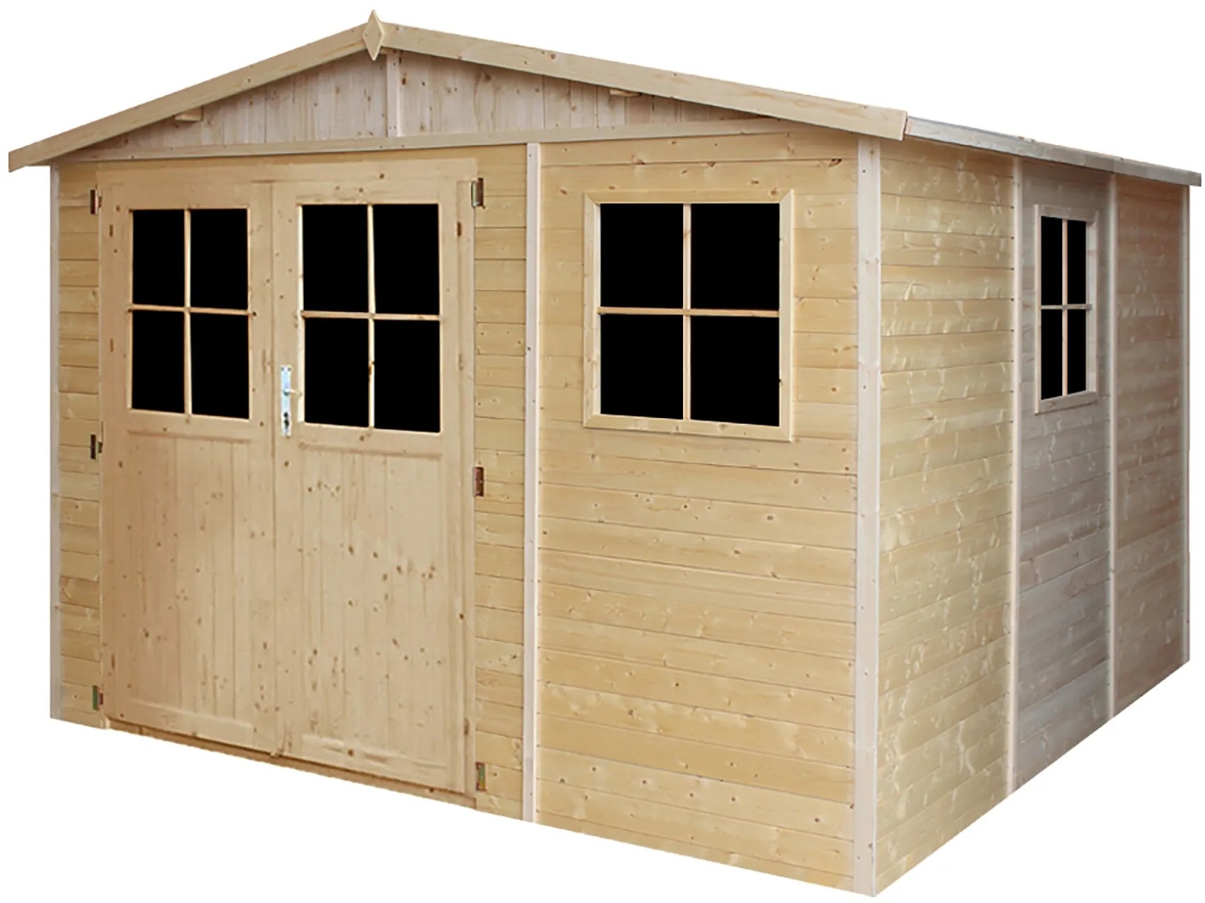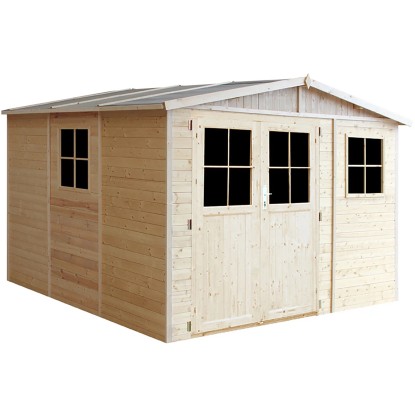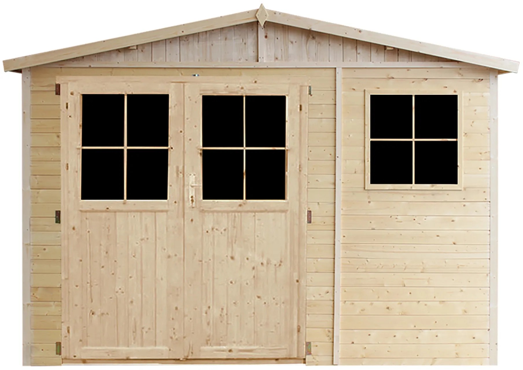 Dřevěný zahradní domek Timbela M335F+M335G, 9 m2, s okny, dveřmi se zámkem a podlahou je perfektním řešením do vaší zahrady. Praktická plocha 9 m2 poskytuje dostatek místa na veškeré zahradní nářadí, sportovní vybavení nebo zahradní nábytek. Do sebe zapadající obložení a střešní krytina chrání obsah před povětrnostními vlivy.
