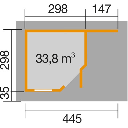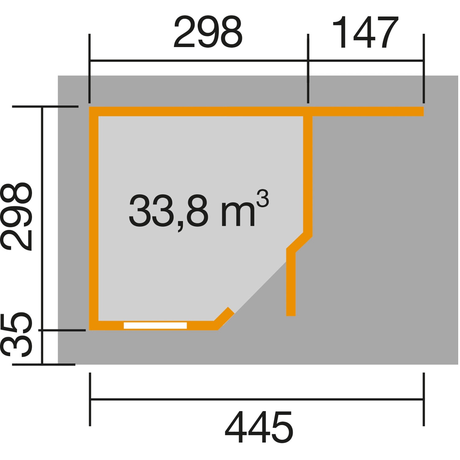 Weka dřevěný zahradní domek je kompaktní a má půdorysnou plochu 8,88 m2. Moderní zahradní domek se hodí pro univerzální použití jako kůlna na nářadí, zahradní altán nebo chatka. Má průchozí šířku 81 cm a výšku 195 cm. Široký vchod umožňuje snadný vstup do dřevěného zahradního domku i s většími přístroji, zahradními potřebami, jízdními koly a zahradním nábytkem.