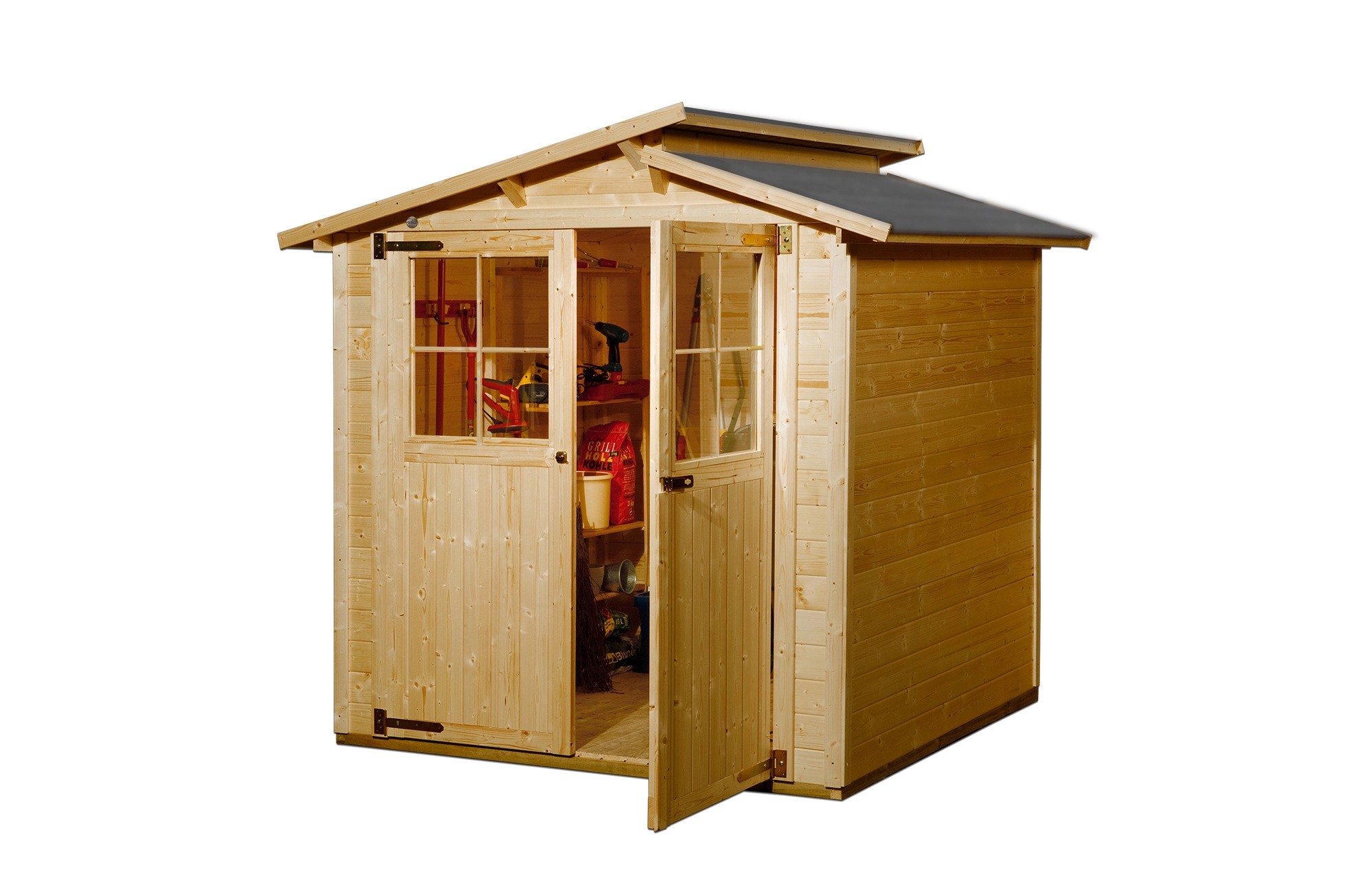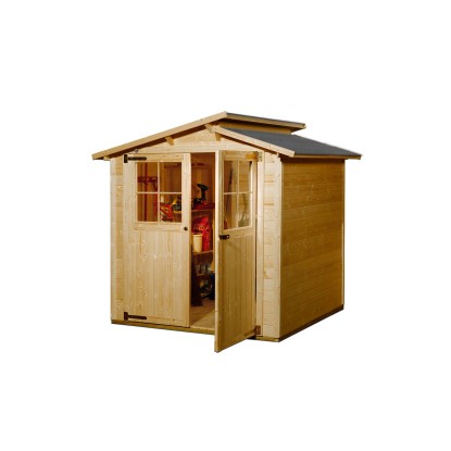 Zahradní domek je vyroben z lazurovaného dřeva. Díky lazuře zůstává zachován přírodní vzhled s dřevěnou kresbou a domek je chráněn proti povětrnostním vlivům. Pro montáž zahradního domku nemusíte být profesionálním řemeslníkem. Díky praktickému zásuvnému šroubovacímu systému lze bez jednotlivé díly snadno spojit. Kvalitní rámové dvoukřídlé dveře se světelnými výřezy s klikou a zámkem s cylindrickou vložkou zajišťují prosvětlení vnitřních prostor. Domek má robustní konstrukci se stěnami o tloušťce 19 mm. Maximální zatížení střechy sněhem činí 75 kg/m2.