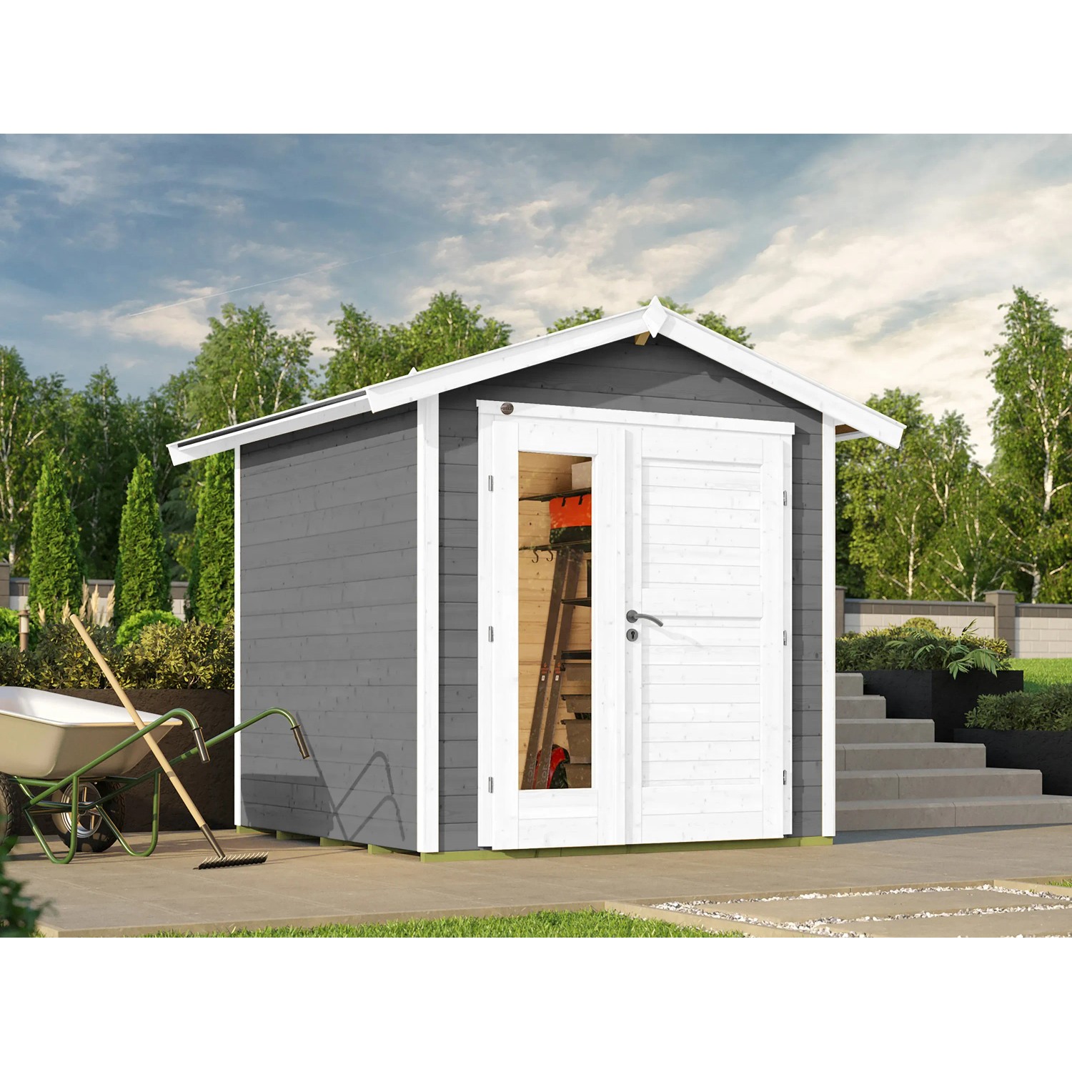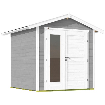 Dřevěný zahradní domek zaujme svým moderním designem a je veden v jednoduché šedé. Je vhodný pro univerzální použití jako kůlna na nářadí, zahradní altán nebo domek pro volný čas.