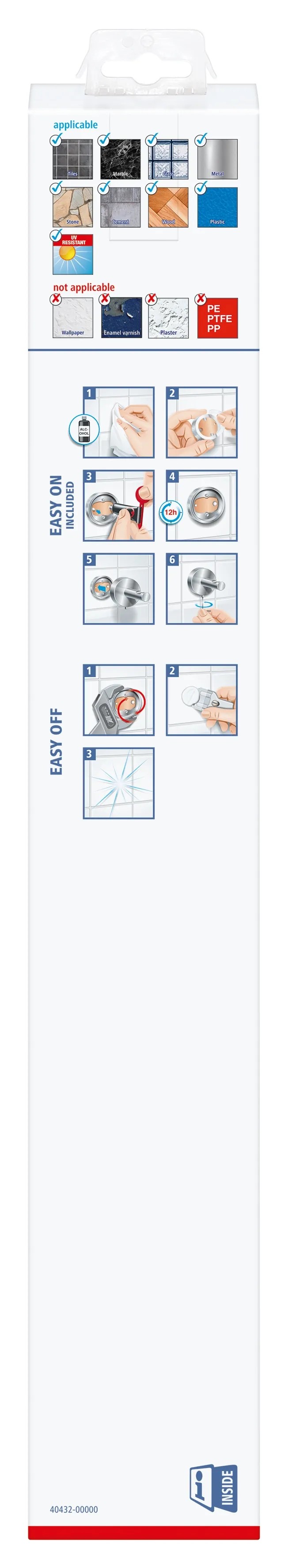 Předmět lze snadno a čistě připevnit na zeď bez vrtání nebo šroubování. Poté, co nasadíte montážní adaptér a naplníte jej lepidlem, které je součástí dodávky, počkejte 12 hodin a poté můžete položku bezpečně připevnit natrvalo. Přiložená upevňovací sada obsahuje upevňovací adaptér, lepidlo a imbusový klíč pro fixaci. Předmět je vhodný pro připevnění na dlaždice, kov, přírodní kámen, mramor, sklo, dřevo a mnoho plastů. I přes přídržnou sílu až 6 kg jej můžete kdykoli vyjmout a znovu použít s novým adaptérem (BK20).