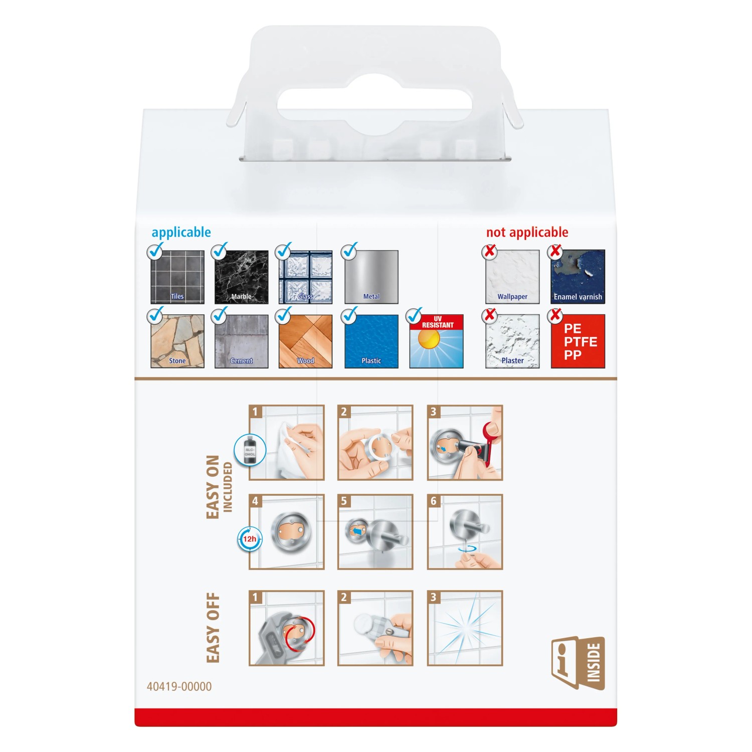 Předmět lze snadno a čistě připevnit na zeď bez vrtání nebo šroubování. Poté, co nasadíte montážní adaptér a naplníte jej lepidlem, které je součástí dodávky, počkejte 12 hodin a poté můžete položku bezpečně připevnit natrvalo. Přiložená upevňovací sada obsahuje upevňovací adaptér, lepidlo a imbusový klíč pro fixaci. Předmět je vhodný pro připevnění na dlaždice, kov, přírodní kámen, mramor, sklo, dřevo a mnoho plastů. I přes přídržnou sílu až 6 kg jej můžete kdykoli vyjmout a znovu použít s novým adaptérem (BK20).