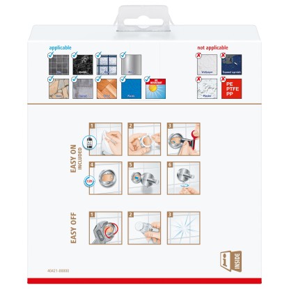 Předmět lze snadno a čistě připevnit na zeď bez vrtání nebo šroubování. Poté, co nasadíte montážní adaptér a naplníte jej lepidlem, které je součástí dodávky, počkejte 12 hodin a poté můžete položku bezpečně připevnit natrvalo. Přiložená upevňovací sada obsahuje upevňovací adaptér, lepidlo a imbusový klíč pro fixaci. Předmět je vhodný pro připevnění na dlaždice, kov, přírodní kámen, mramor, sklo, dřevo a mnoho plastů. I přes přídržnou sílu až 6 kg jej můžete kdykoli vyjmout a znovu použít s novým adaptérem (BK20).