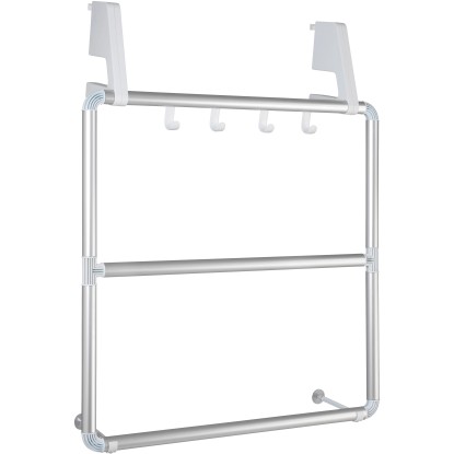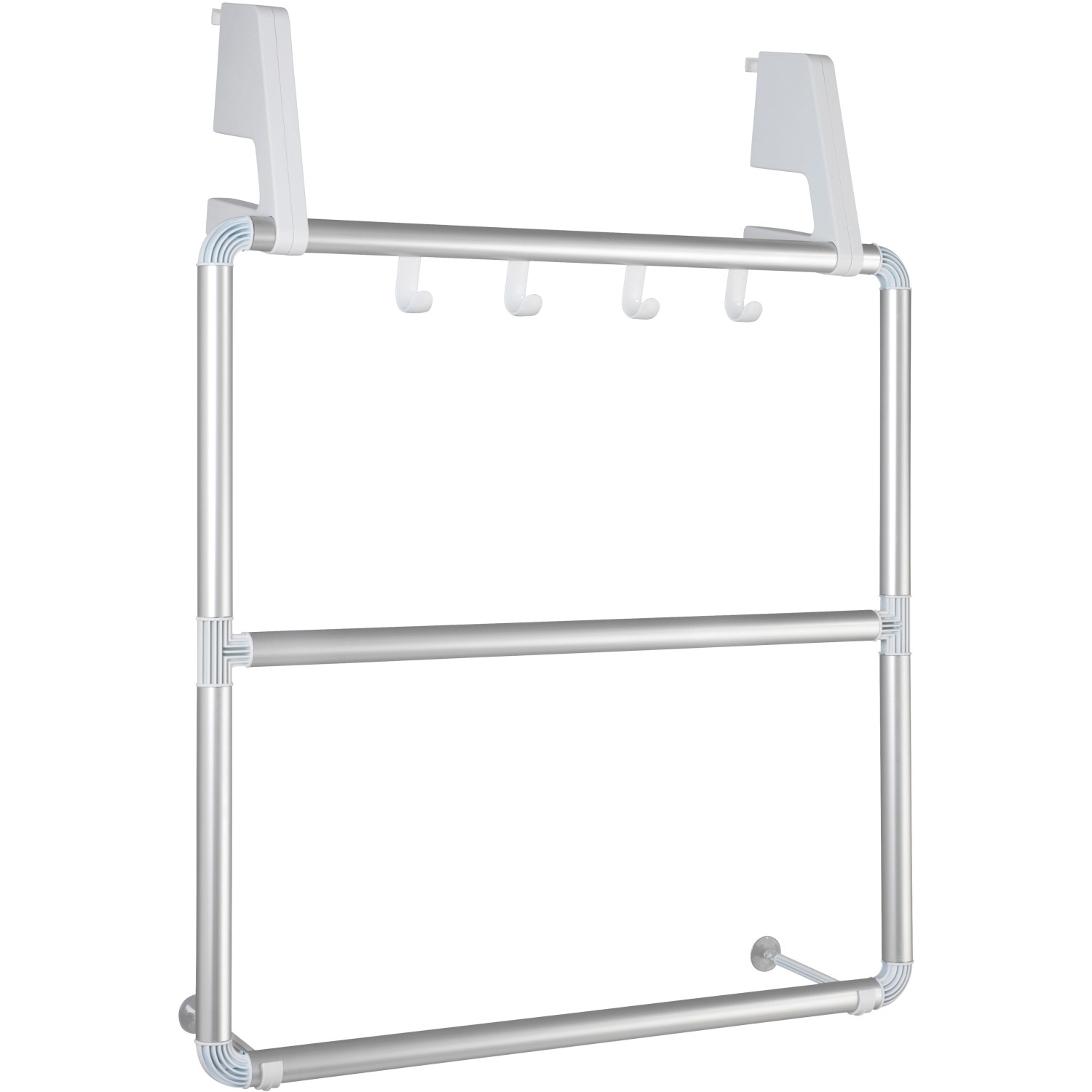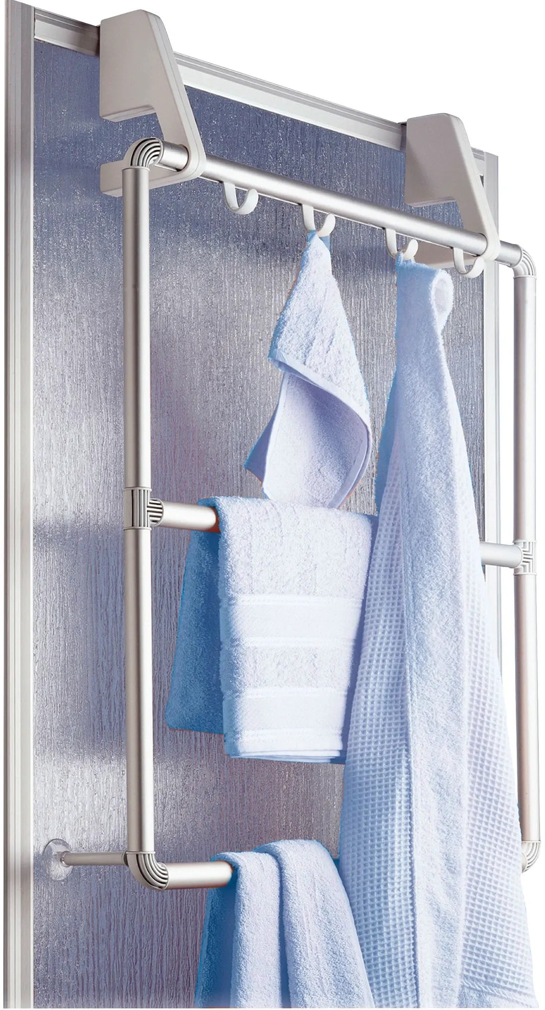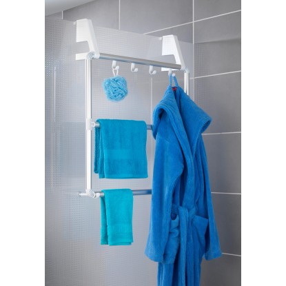 Na 3 šatních tyčích najdou další místo ručníky nebo oblečení a na 4 integrovaných háčcích žínky nebo koupelnové doplňky. Věšák se jednoduše zavěsí na dveře. Závěsné zařízení se hodí na všechny běžné šířky dveří a může se upevnit na stěnu. Dveře lze i se zavěšeným držákem na ručníky nadále bez problémů zavírat.