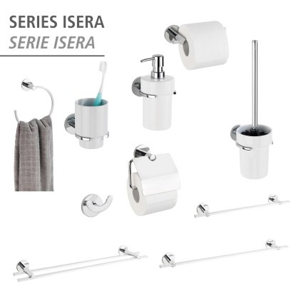 Doplňky z koupelnové série Isera se systémem UV-Loc se vyznačují inspirativním designem, který koupelně dodá jemnou a uklidňující atmosféru. Koupelnové pomůcky jsou vyrobené z vysoce kvalitní nerezové oceli a nástěnné montážní úchytky z kvalitního zinkového tlakového odlitku. Doplňky lze upevnit pomocí přiloženého systému UV-Loc. Pro standardní upevnění jsou součástí dodávky šrouby a hmoždinky.