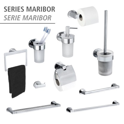 Doplňky pěkně tvarované koupelnové série Maribor mají lesklý povrch. Elegantní pomocníci do koupelny jsou vyrobeny z nerezové oceli s montážní úchytkou ze zinkového tlakového odlitku a propůjčují koupelně luxusní nádech. Doplňky lze upevnit pomocí přiloženého systému UV-Loc. Pro standardní upevnění jsou součástí dodávky šrouby a hmoždinky.